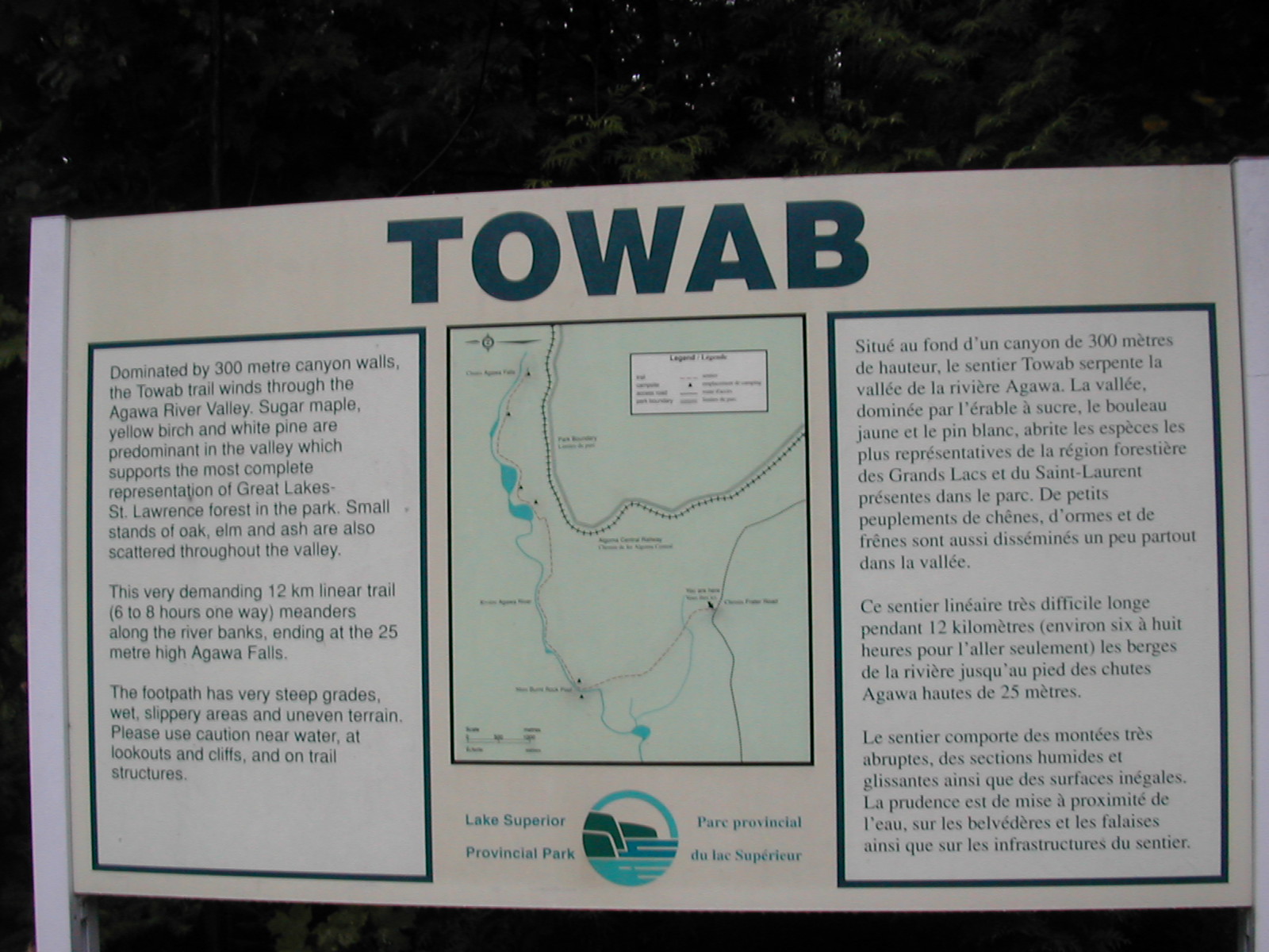 The falls are at the end of the Towab Trail. The trailhead can be reached via Frater road, off of Trans-Canada Highway 17. Frater road is unpaved and rather rough. The trailhead is about three miles from the highway. The trail is 12km long, one way. Hiking in, spending some time at the falls, and hiking out took over 10 hours, and unless you run, I doubt you could do it any quicker. The park actually estimates that it will take you 6-8 hours to hike the trail one way. Many people make it a two day adventure. There are several camp sites along the trail, including one at the top of the falls.