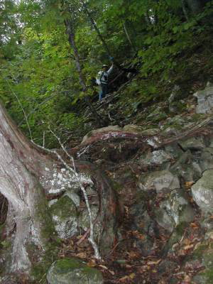 The beginning of the trail is deceptively easy. The first third of the trail is an easy descent through forest to the river bed. The trail follows the river for awhile, and the scenery is very pretty. Just when you think you will get to the falls in no time, the trail starts to look like this. The last third is very rough, with lots of steep ups and downs.