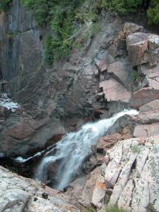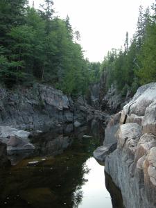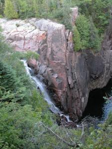 Aguasabon Falls is in Terrace Bay right off of Hwy 17. The paved road to the falls is just west of the town and is well marked. This waterfall is definitely best seen when the water is higher. In all of the pictures I have seen there is a torrent rushing over the cliffs (see the photos in the Terrace Bay website). In August the water stays in contact with the rocks largely due to the fact that most of the water is diverted upstream for power generation.