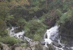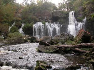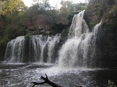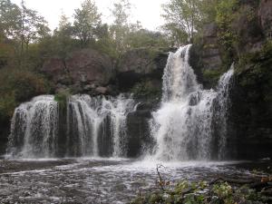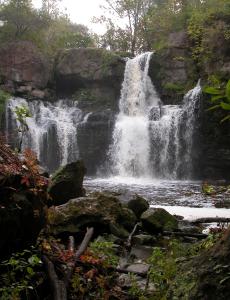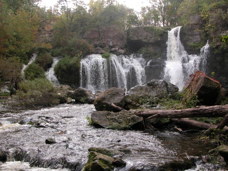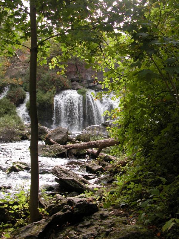 Akron Falls is a complicated waterfall whose appearance depends greatly on the amount of water. There are three distinct parts to the falls. On the right side, facing the falls, the creek plummets 40 or so feet straight down. In the middle section, the creek comes out of the rocks about 20 feet up. The left most part of the falls is a rocky cascade. In lower water, the 40 foot drop dries up.