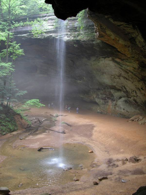 The falls plummets from the rim of Ash Cave, one of the highlights of Hocking Hills State Park. The horseshoe shaped recess cave is 700 feet long, 100 feet deep, and 90 feet high. Even if there is no water flowing it is an impressive site. The cave is so named because early settlers found huge piles of ash left behind by the Native Americans.