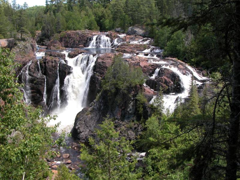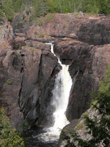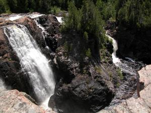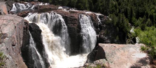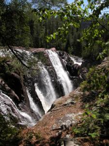 Aubrey Falls is a large, isolated and very interesting waterfall over 80 km north of Lake Huron on the Mississagi River. The falls are the center of the small Aubrey Falls Provincial Park. There is a large dam and power station here, and the flow over the falls is greatly reduced or even stopped at night or during the non-summer months. Otherwise the station is mostly unobtrusive.