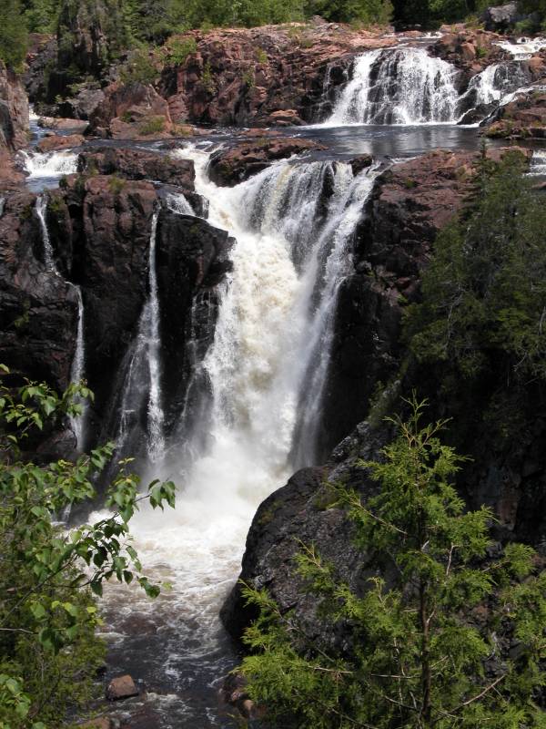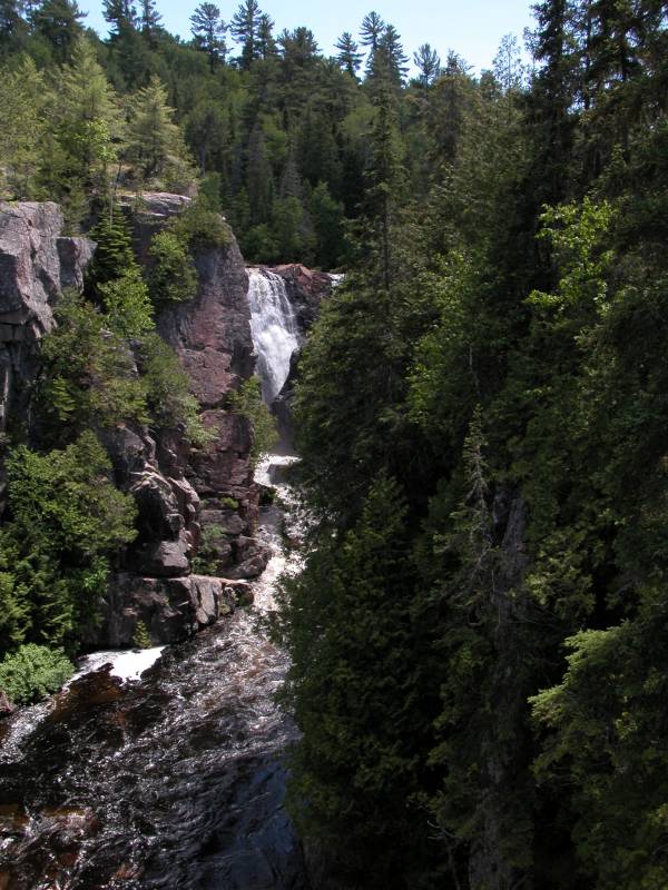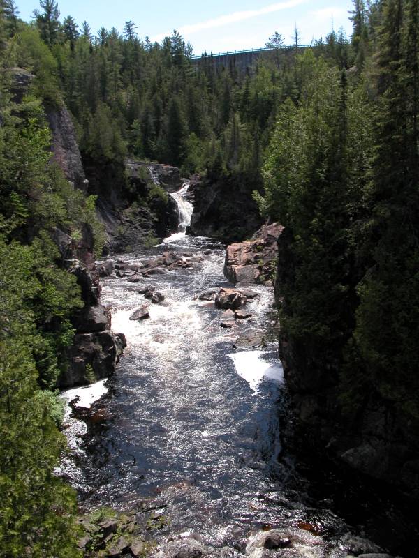 This is a complicated waterfall. The Canadian Shield seems to be quite a challenge for rivers. The river cascades over the rocks in many places and is in the process of carving out an island at the base of the falls. Just below the falls the river takes a sharp right turn and runs through a deep gorge. There are several drops. The main drop is about 20 meters high.
