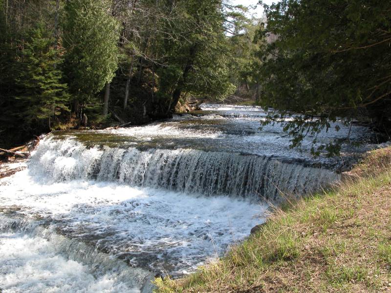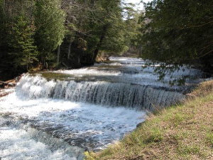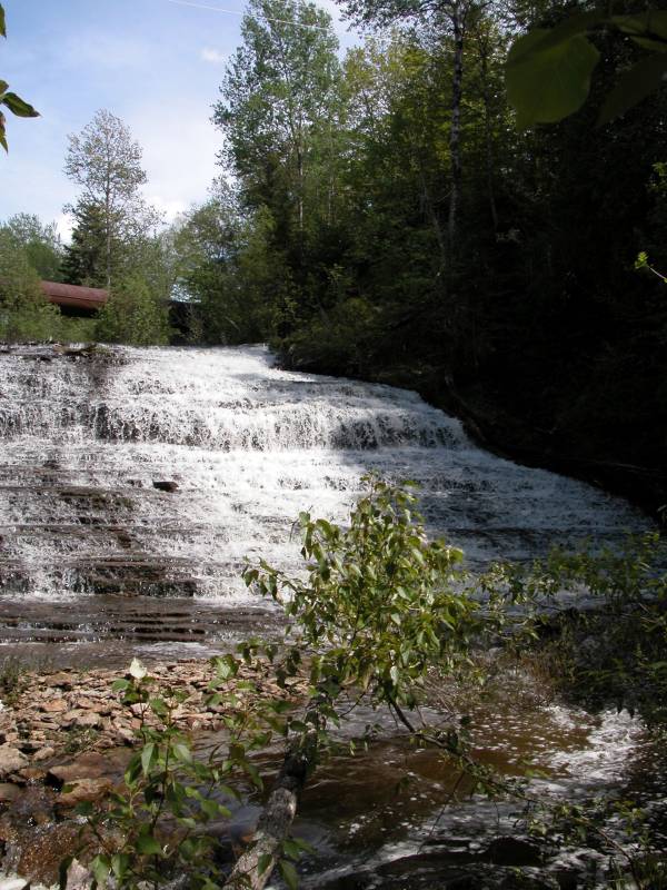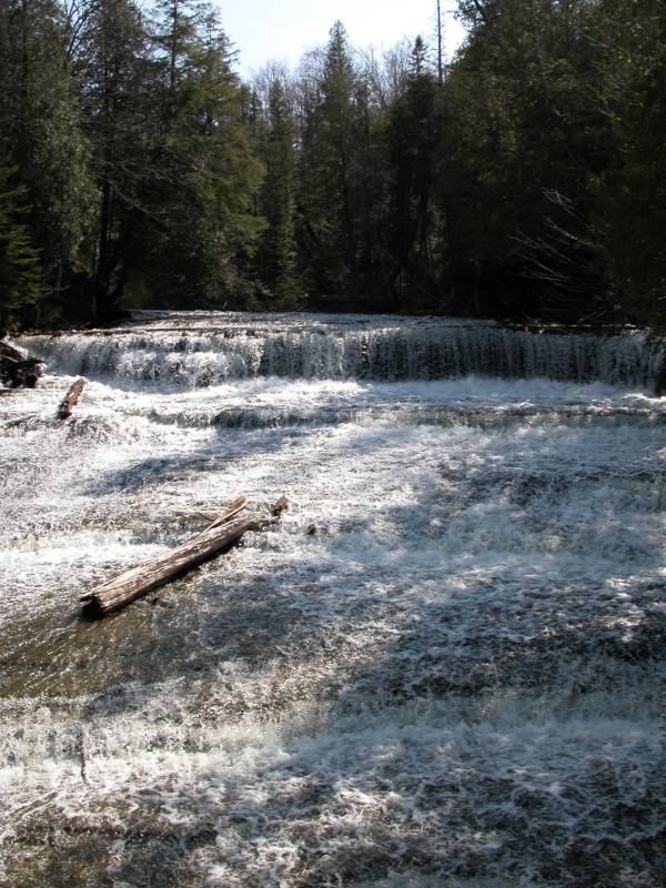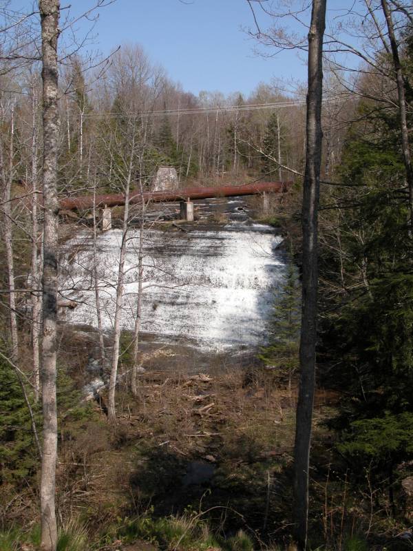 The Autrain River has been dammed. M-94 passes just below the dam and you can see the reservoir from the road. Unfortunately they chose to run the pipes that carry water from the reservoir to the power plant right above the big upper falls. What makes it even more unfortunate is that the pipes cross the river twice, once well out of sight and the second time right above the falls. It is a shame they could not have come up with a somewhat more esthetically pleasing design.