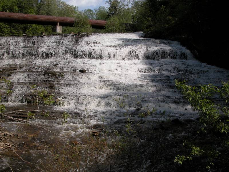 The upper falls are a large ramp about 40 feet high. The lower falls is a short walk down the road and consists of a drop of less than 10 feet. You can get to the base of big falls with a little effort. It is hard to get a picture of the entire falls from the base due to the width of the falls. There are a couple of angles that make the falls look much wilder than they actually are.