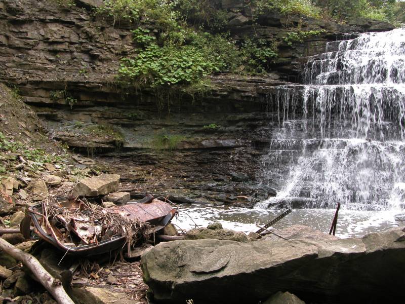 The remains of a snowmobile are lying near the base of the falls. You can find the oddest stuff in gorges.