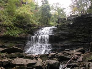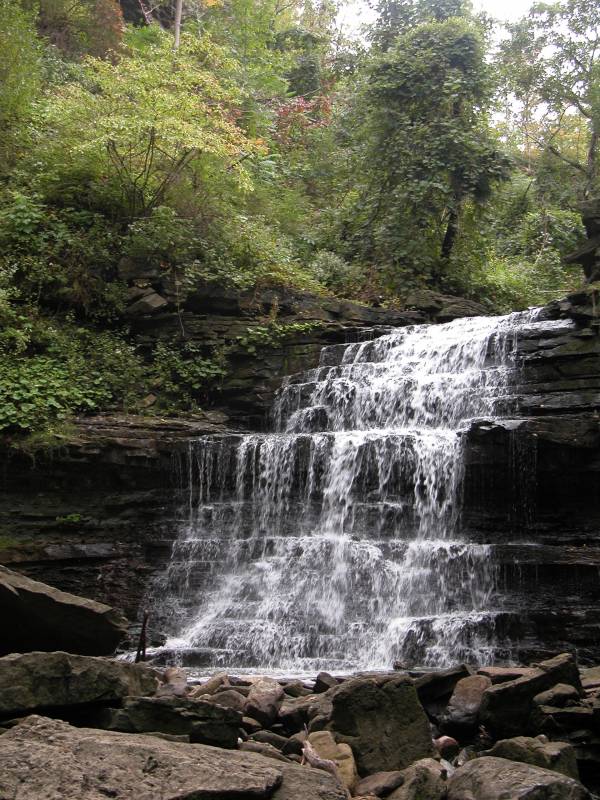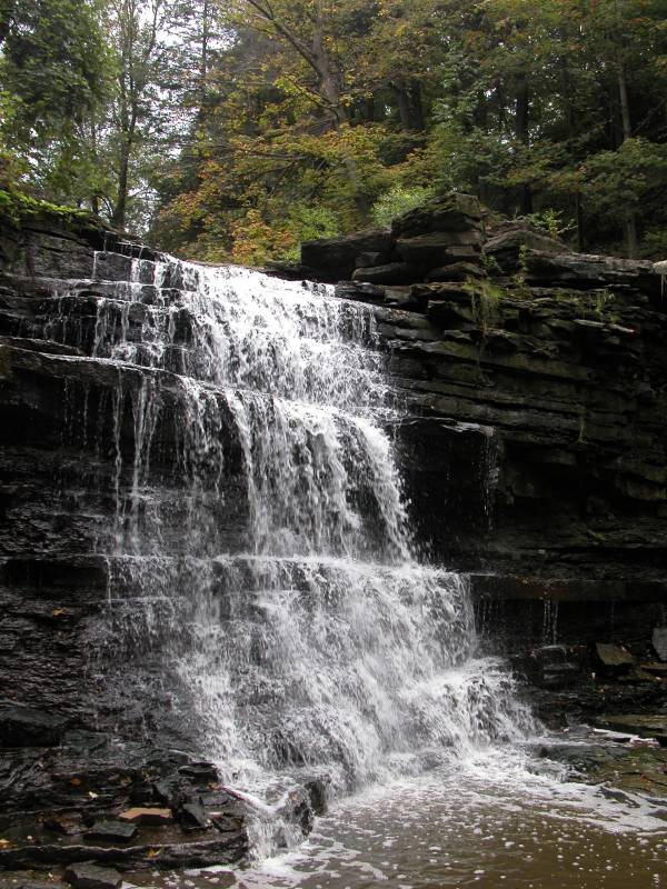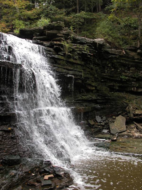 In high water the falls is spreads across the entire ledge. Hiking up the stream may be treacherous in those conditions.