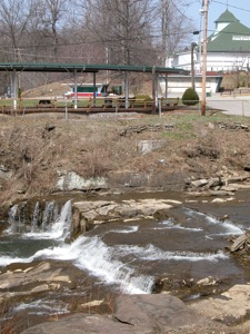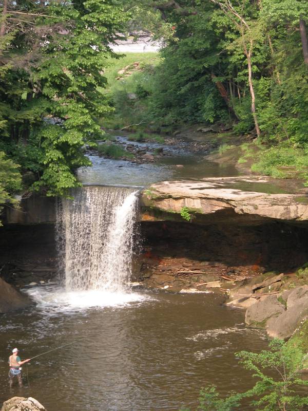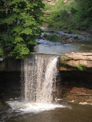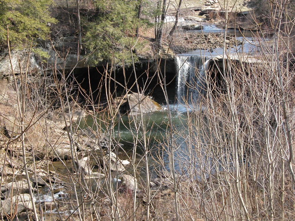 When I visited the falls in March 2009, a lot of small trees had grown up in front of what had been the best vantage for the falls. I do not know if this is temporary. You can always get a clear view of the falls if you walk up the creek to the base of the falls.