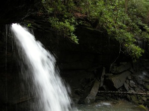 Black Fork Falls is a true plunge falls, and you can walk behind the falls if you want. You will likely get wet, and the footing is not good.