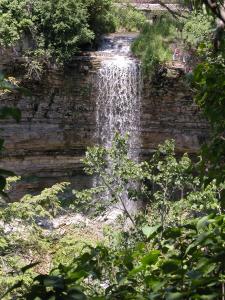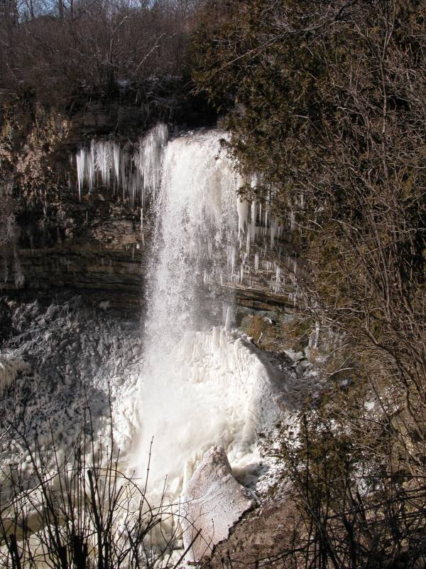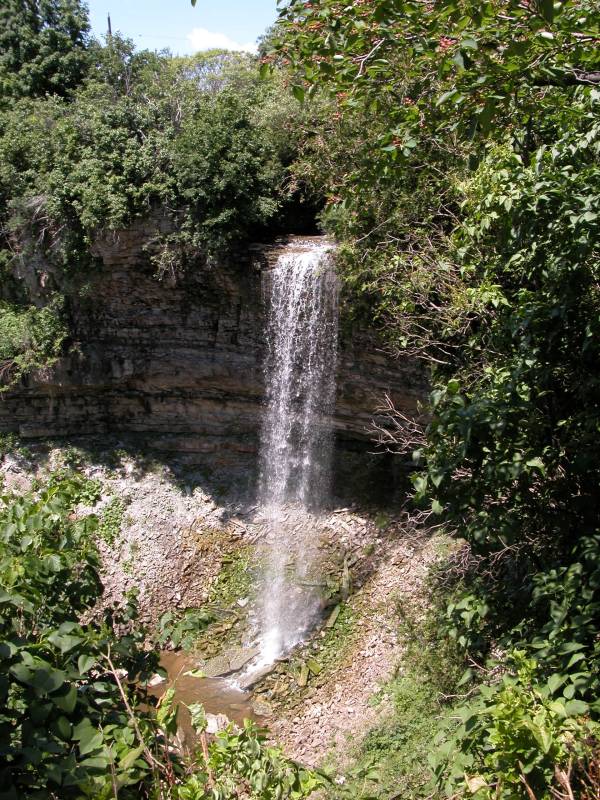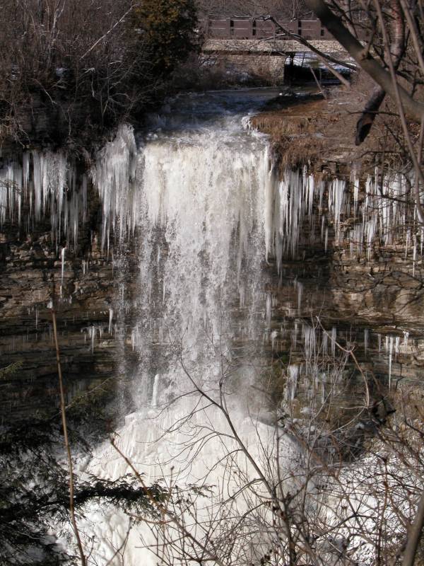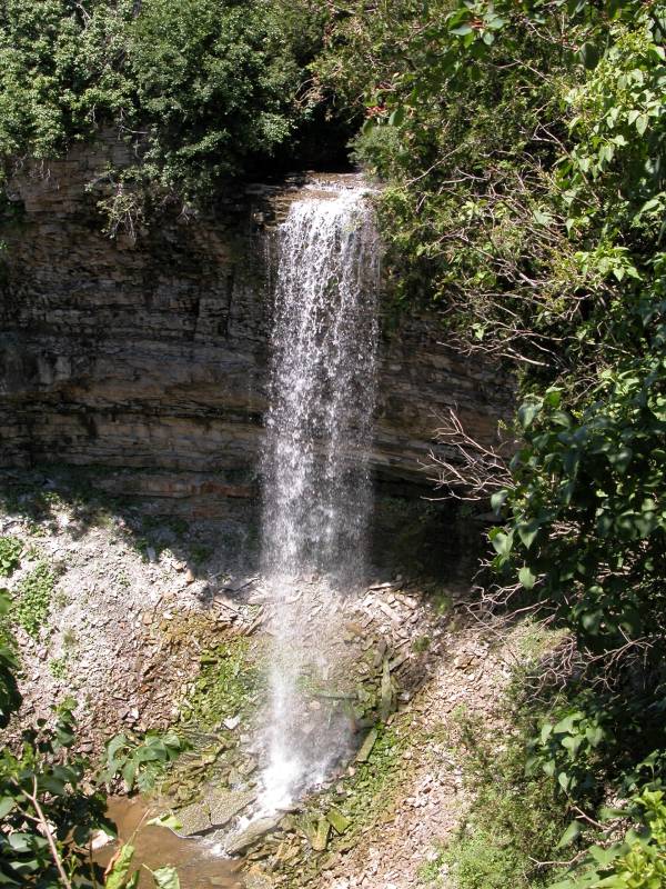 The one easily available view of the falls is from the north side of the gorge, a short distance from where Rock Chapel Rd crosses Borers Creek. You can park at the Rock Chapel Sancturay, which is on the south side of the gorge, and walk along the Bruce Trail (which hugs Rock Chapel Rd at this point) for five minutes. Some people also park on the north side of the gorge right next to the road, but I do not know if this is strictly legal.