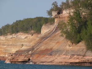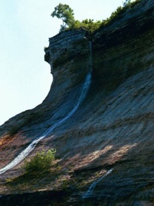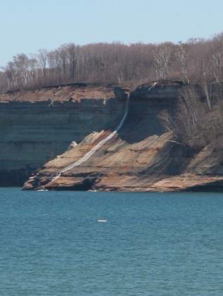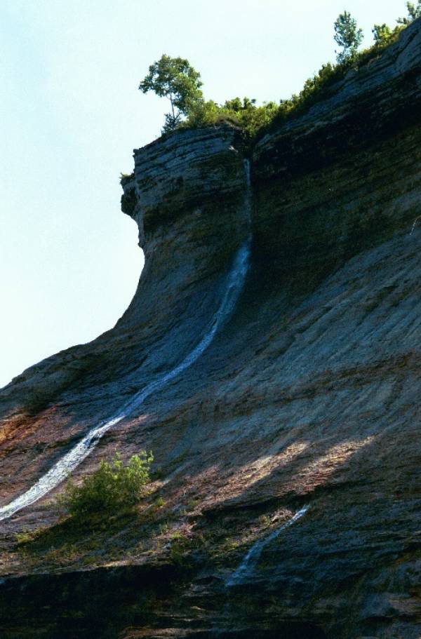 Bridal Veil Falls is along the Pictured Rocks National Lakeshore, about 1.5 miles from Miner's Beach. It is a long slide that drops straight into Lake Superior. It is probably best seen from the water, although you can hike to it. According to the topographic maps the cliffs are over 160 feet high at the point the trail crosses above the falls. The falls slides directly into the lake for a total drop of at least 140 feet making this the tallest waterfall in Michigan.