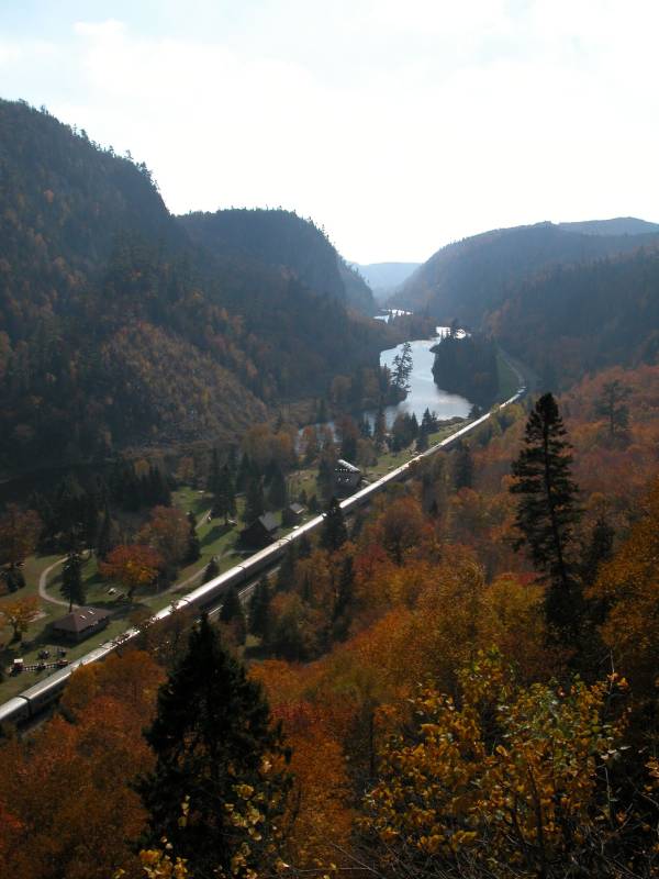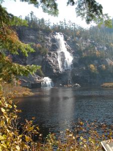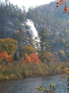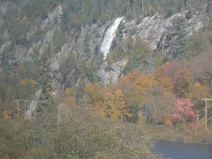Bridal Veil Falls can be seen from the train as you enter or leave the canyon. The falls lands in the Agawa River on the side opposite the park. It is a short walk on a level groomed trailed from the train to the viewing area. Getting closer to the falls would require you to somehow cross the river. People do canoe down the Agawa River, and the train will transport your canoe for you.