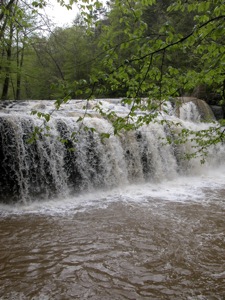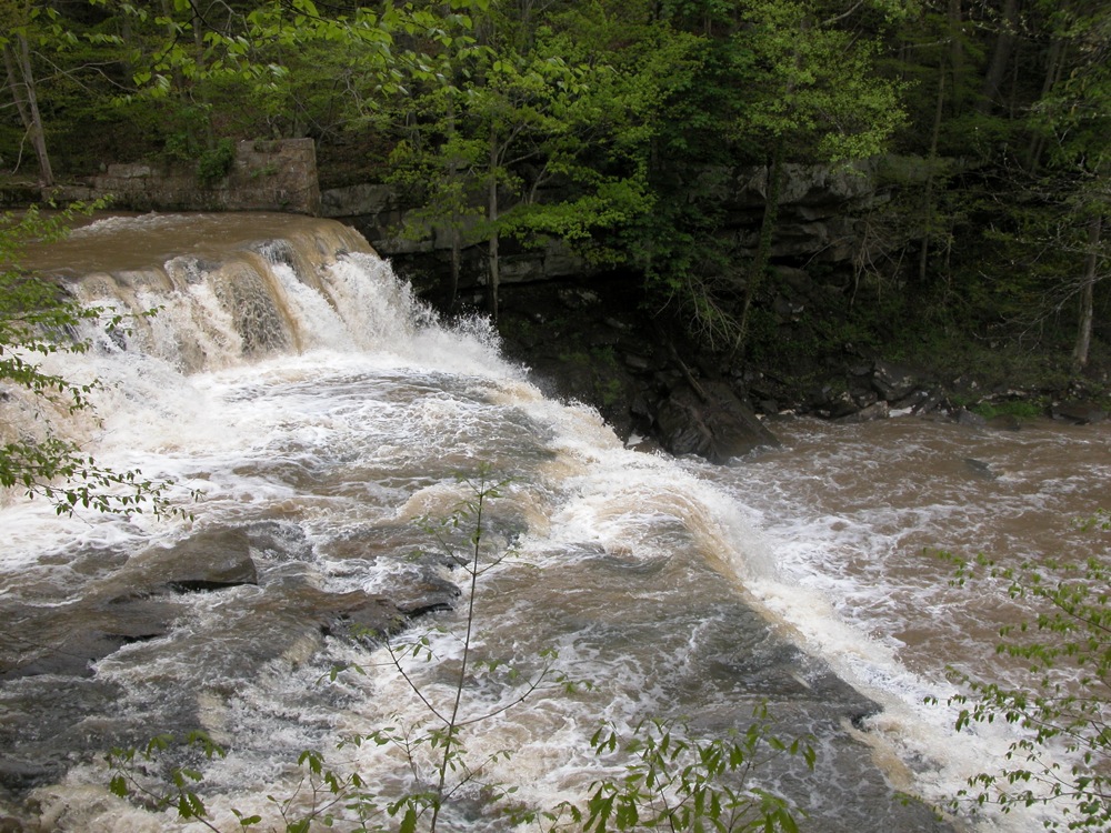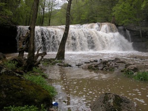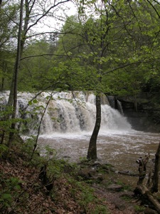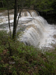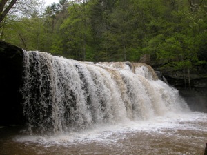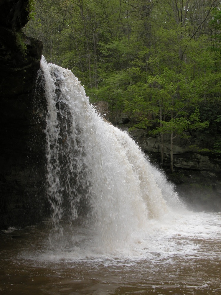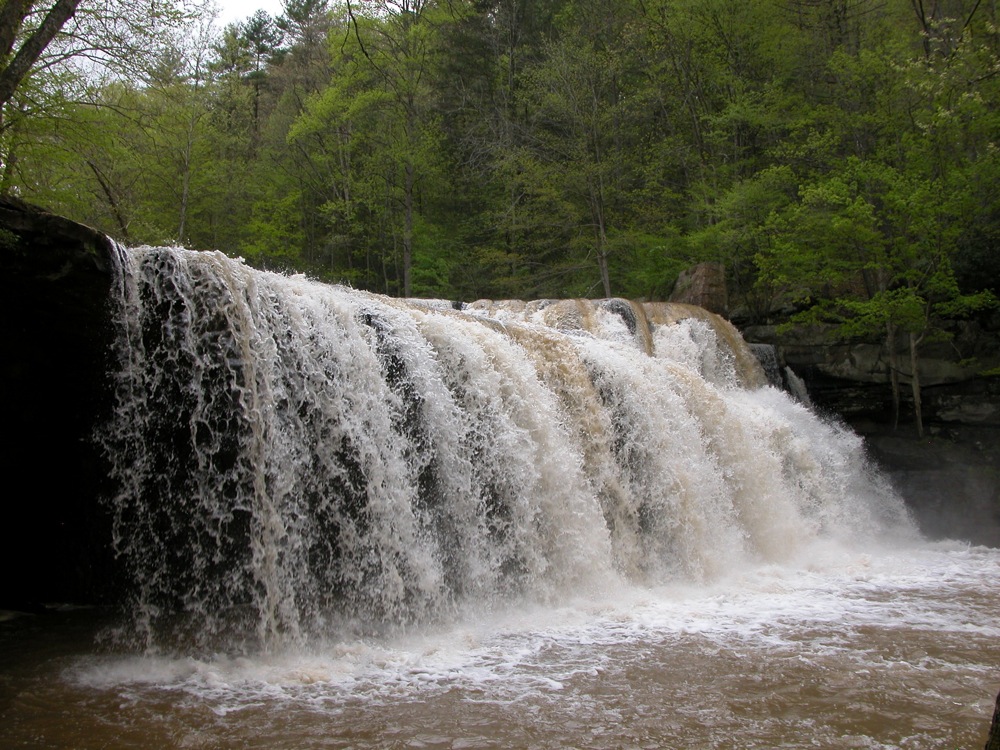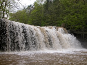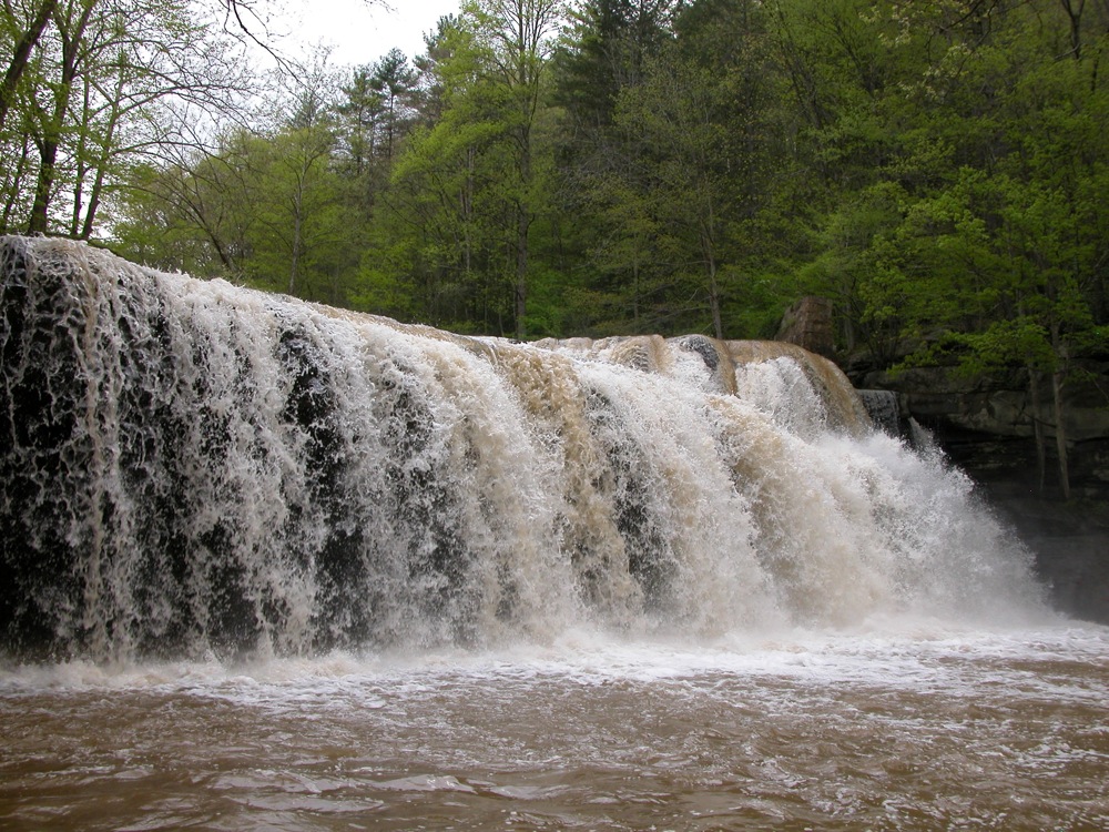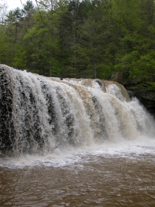 Brush Creek Falls drops 25'. The creek is 50+ wide, depending on water levels. The photos on this page show the falls after several days of rain. Typically the amount of water here will be much less. This is a very accessible falls. You can walk up to the brink of it and down to the base. In low water levels you might even be able to get behind parts of the falls.