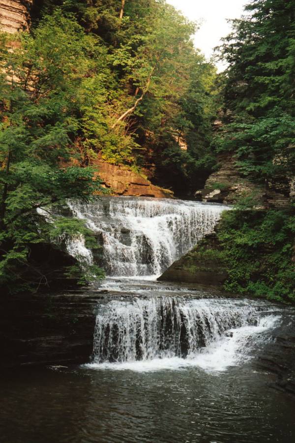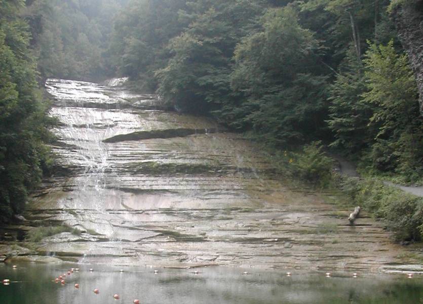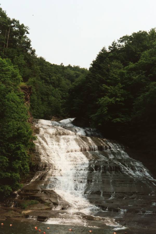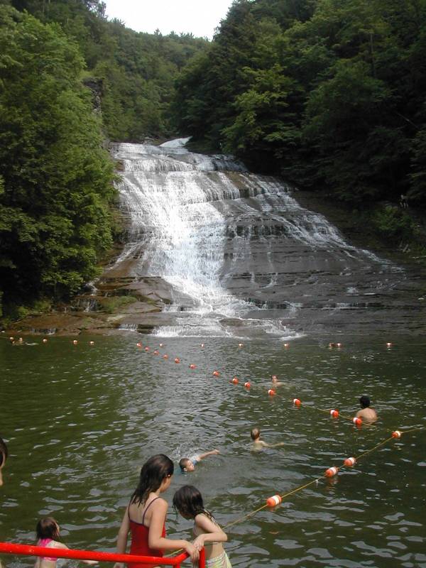 Buttermilk State Park is on Route 13, south west of Ithaca. It is on the map and is easy to find. The falls are clearly visible from the entrance to the park. There is a swimming area at the base of falls, complete with life gaurds. The gorge trail is 3/4 miles long and very steep in places. The trail gains 500 feet in elevation. Some other minor falls can be seen along the way, as well as swimming holes favored by the locals (the signs say no swimming). The gorge trail was a little frustrating because there was no good way to get nice views of what seemed to be the most interesting parts. In particular, just above the main fall where the creek takes a sharp turn, there seemed to be a lot of interesting stuff going on but no way to really look at it. Maybe there are other trails, or maybe you just have to ignore all the danger signs. I was not at the park long enough to really explore.