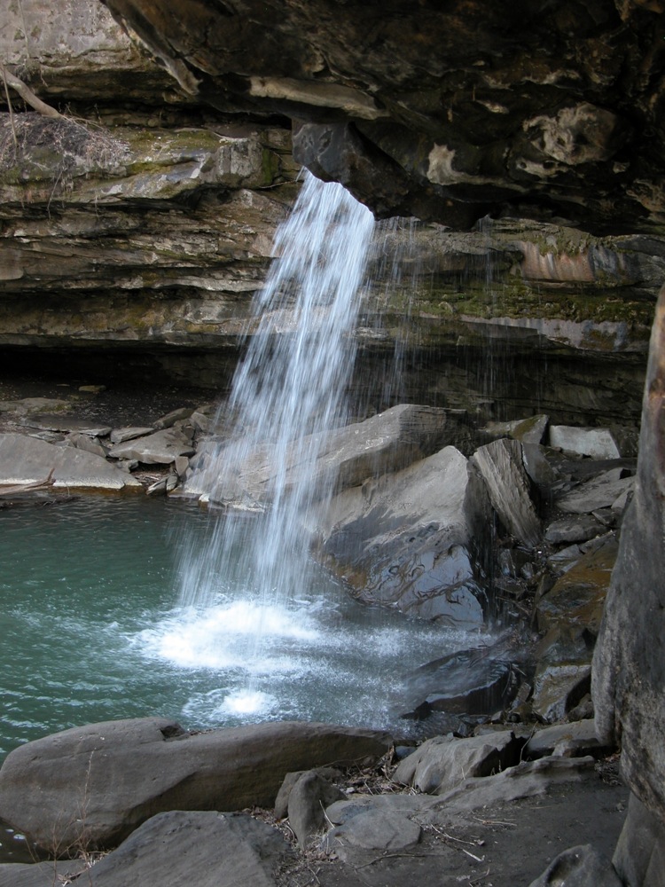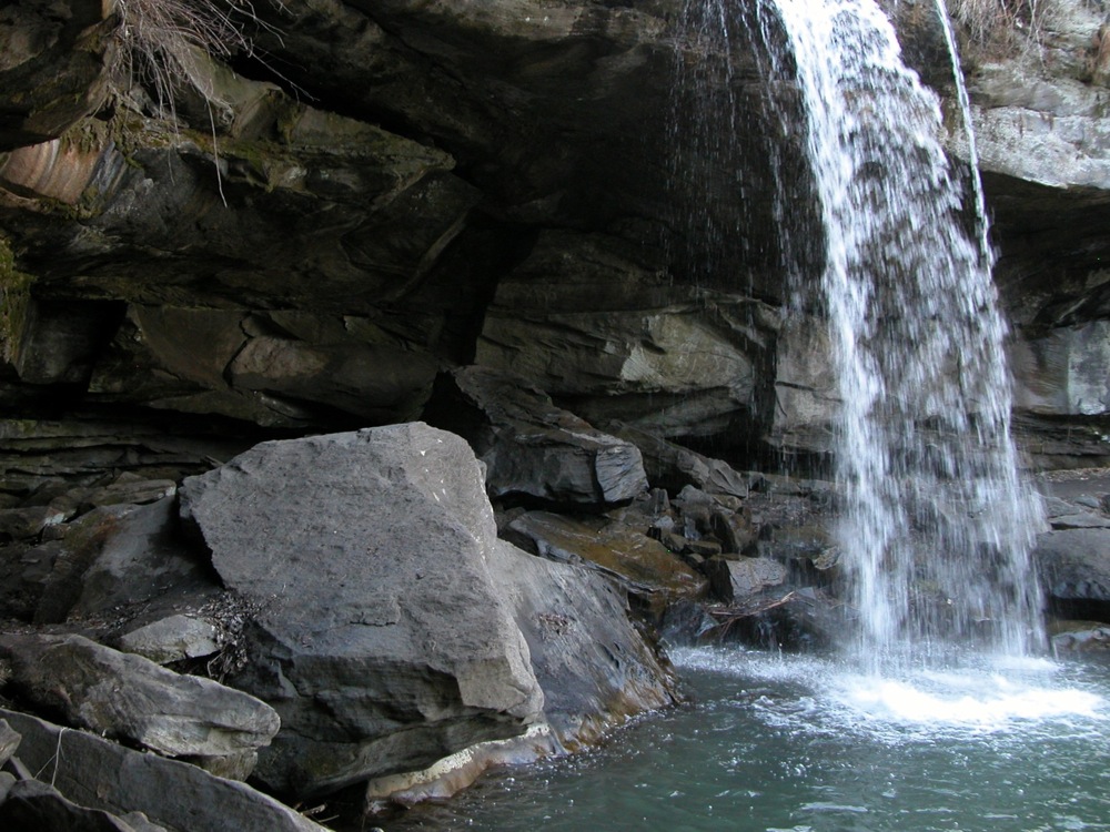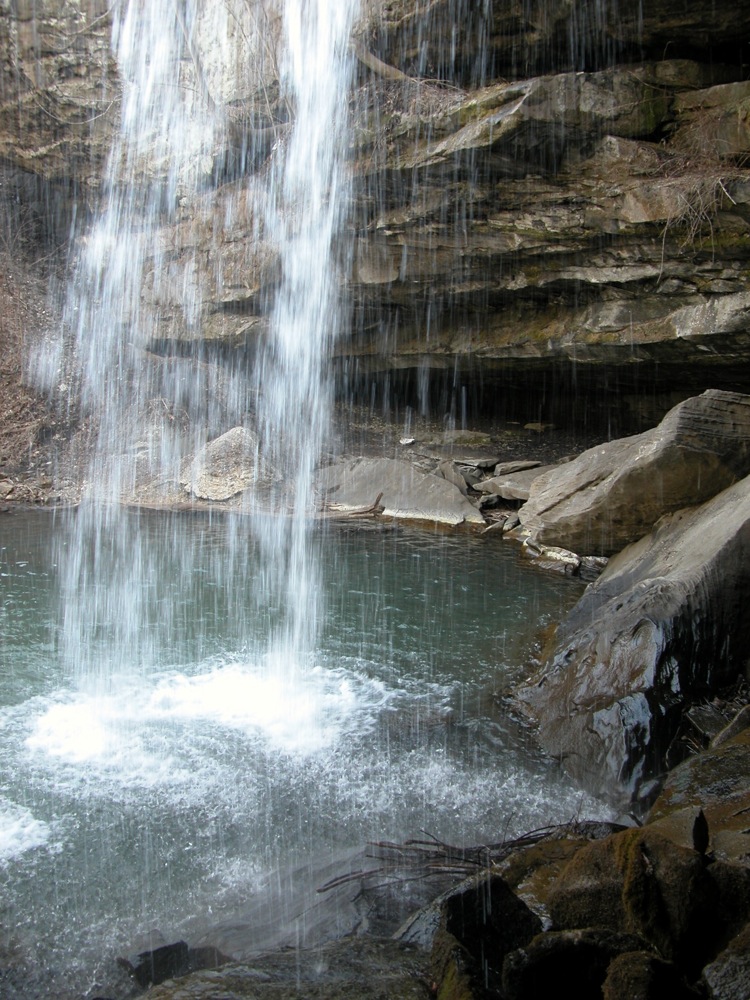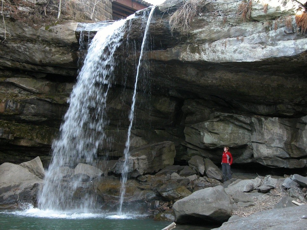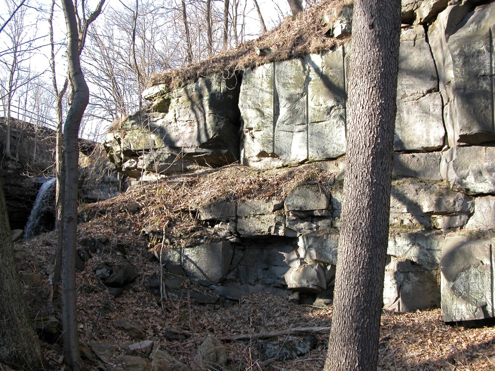There is a railroad above the falls, and the gorge below the falls was used as a quarry. You can see evidence of the holes they drilled to remove blocks of stone. The water also has a certain odd color I've come to associate with run off from urban areas. But despite all that, it is still a pretty waterfall, and very easy to visit. This is a classic plunge waterfall, and you can easily walk behind it without getting wet.