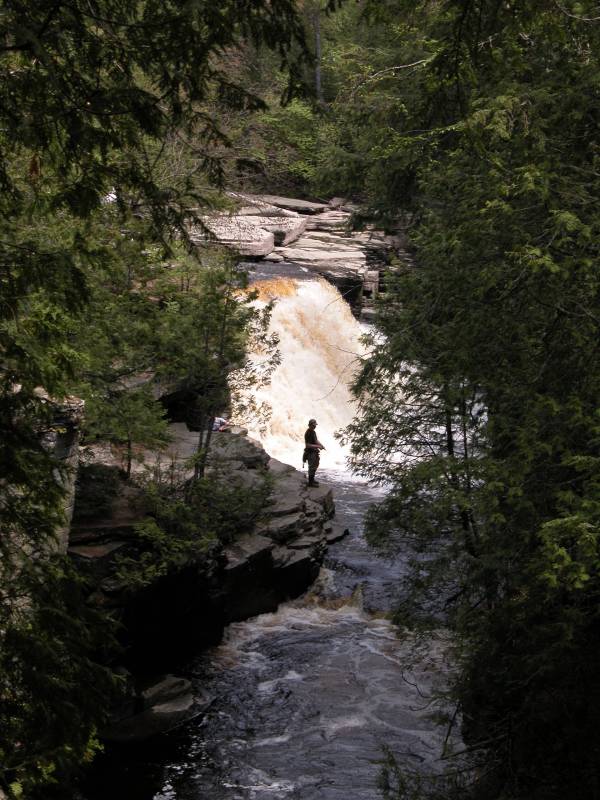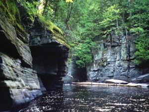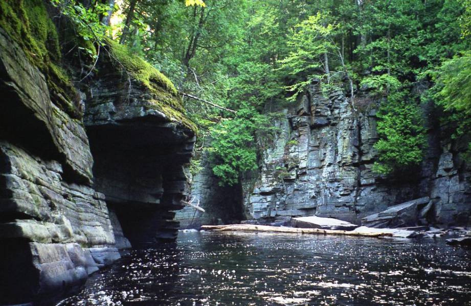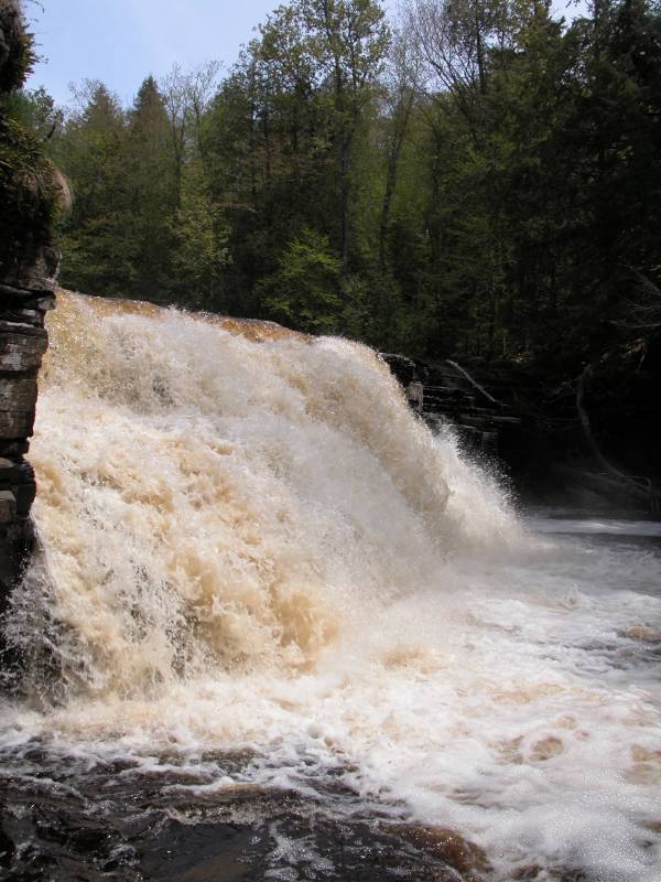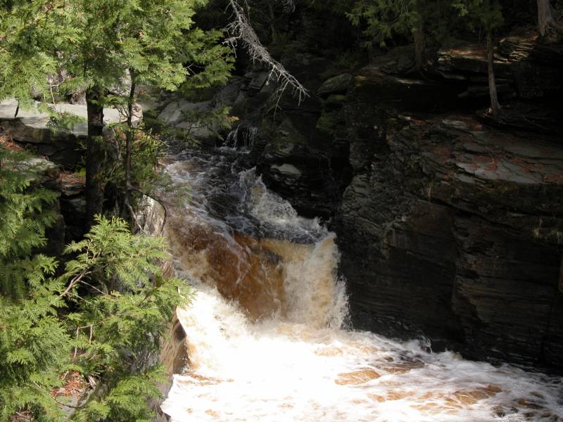 Beyond the falls the river has cut a gorge into the rocks, and an unmaintained trail continues along the rim of the gorge. The gorge is quite interesting, especially by Michigan standards. The rock has broken along straight line faults, resulting in a very boxy canyon. Numerous rapids and some smaller drops can be found downstream. Much farther downstream, where Sturgeon Falls is located, the gorge widens and deepens, becoming a mile wide and 300 deep. This is the "grand canyon of Michigan".
