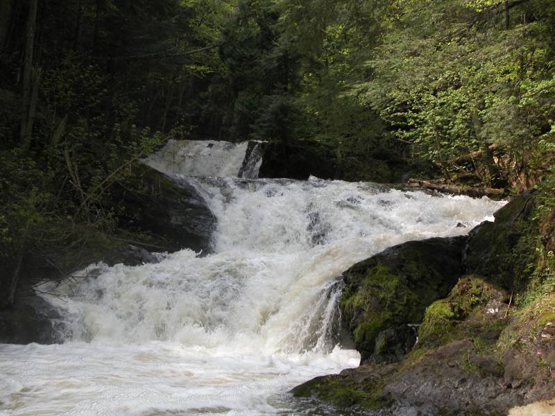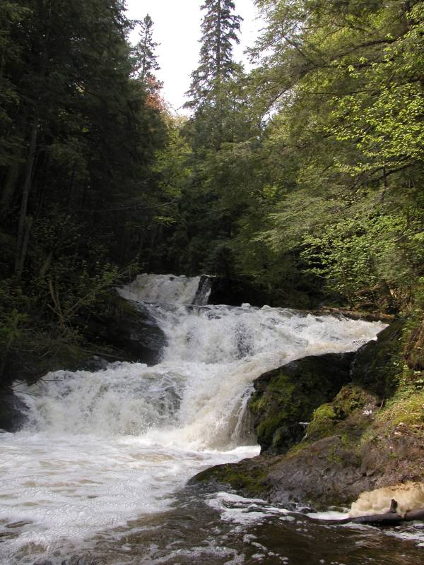Reaching this waterfall is not easy, and getting a good view of it requires a precarious climb into and out of the gorge. From Morgan Falls you can cross Morgan Creek above the falls (there is a crude bridge) and follow a rough trail upstream along the banks of the Carp River for about 1/2 mile. You will see and hear lots of white water. The trail goes high above the river when you reach the falls, and there are no good views from the rim, so if you really want to see it, you need to climb down, and then back up.