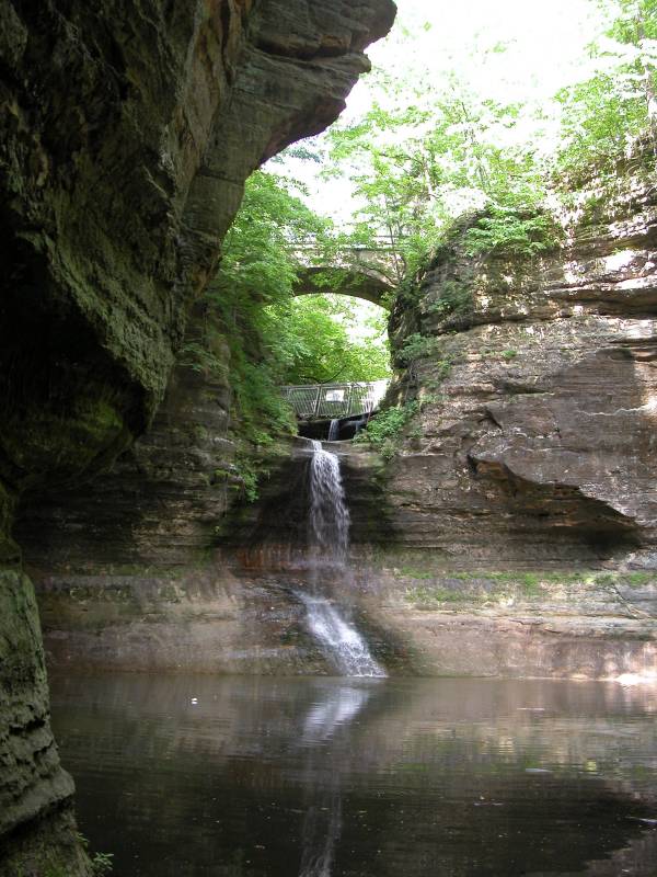 This is a small park and you can explore all the trails in a single day. From the parking area a flight of stairs with at least 100 steps leads down to the rim trail. There is a bridge across the gorge just above the falls. To reach the base of the falls, go left, or cross the bridge and go left. There is another bridge about 1/4 mile downstream of the falls and an interesting concrete stairway that takes you down into the gorge. It is a pretty walk back up to the falls. You do have to rock hop across the stream at one point.