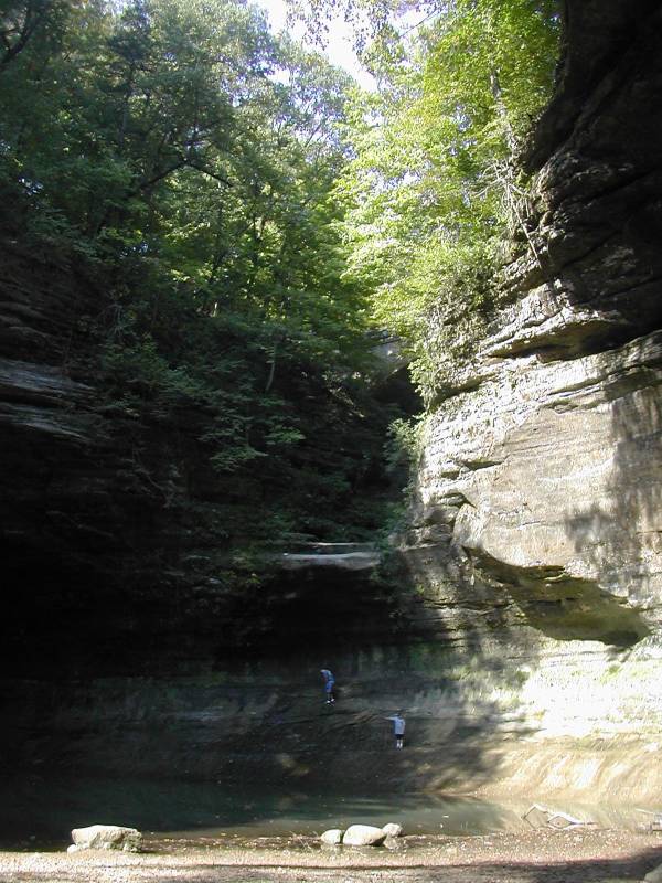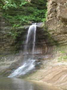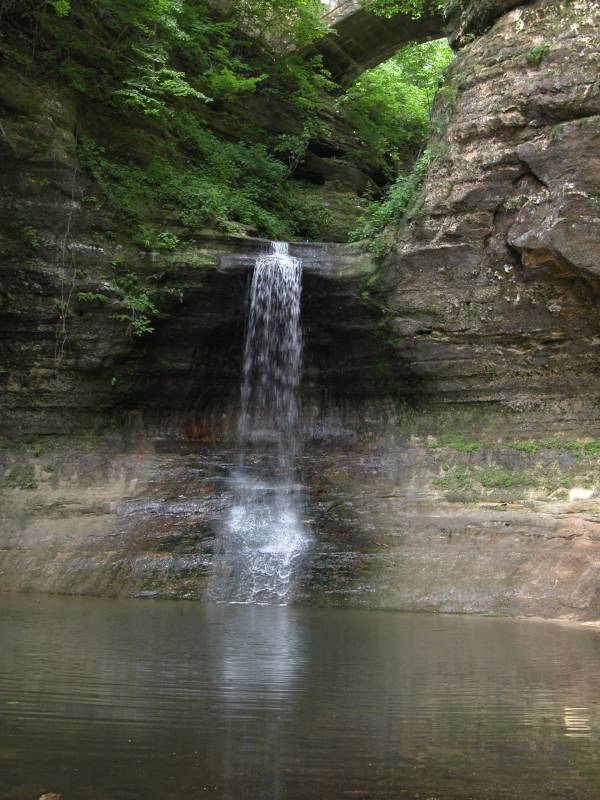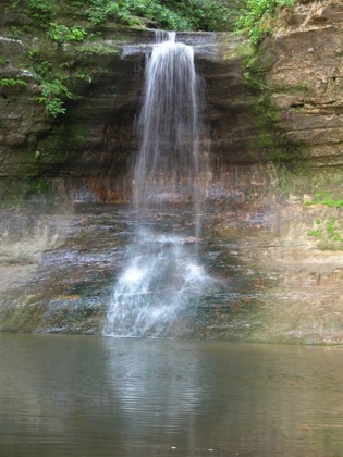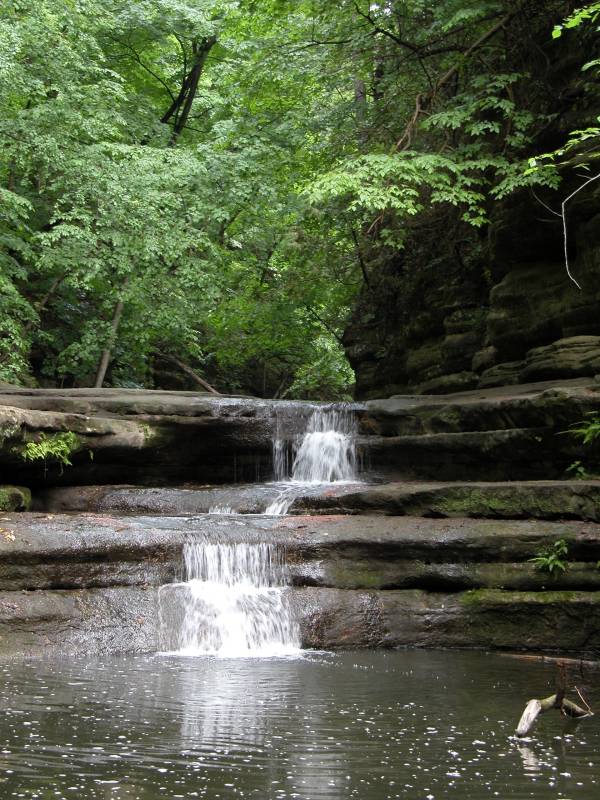 Cascade Falls is in Illinois' Matthiessen State Park. Here a number of small streams have carved out a little labyrinth of gorges in the sandstone. The main canyon is a mile long. At Cascade Falls the gorge floor drops 45 feet and below the falls the canyon is 100 feet deep with steep sandstone cliffs on either side.