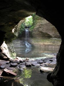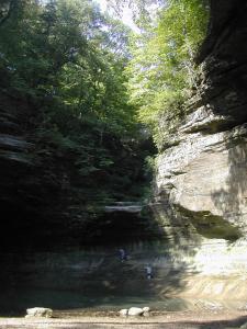 The stream has carved out an impressive amphitheater at the base of the falls. The walls overhang the gorge causing the sound of the falls to echo. Small caves have been carved into the walls on both sides. The caves on the west side are connected by short tunnels, one which leads to a nice view of the falls.