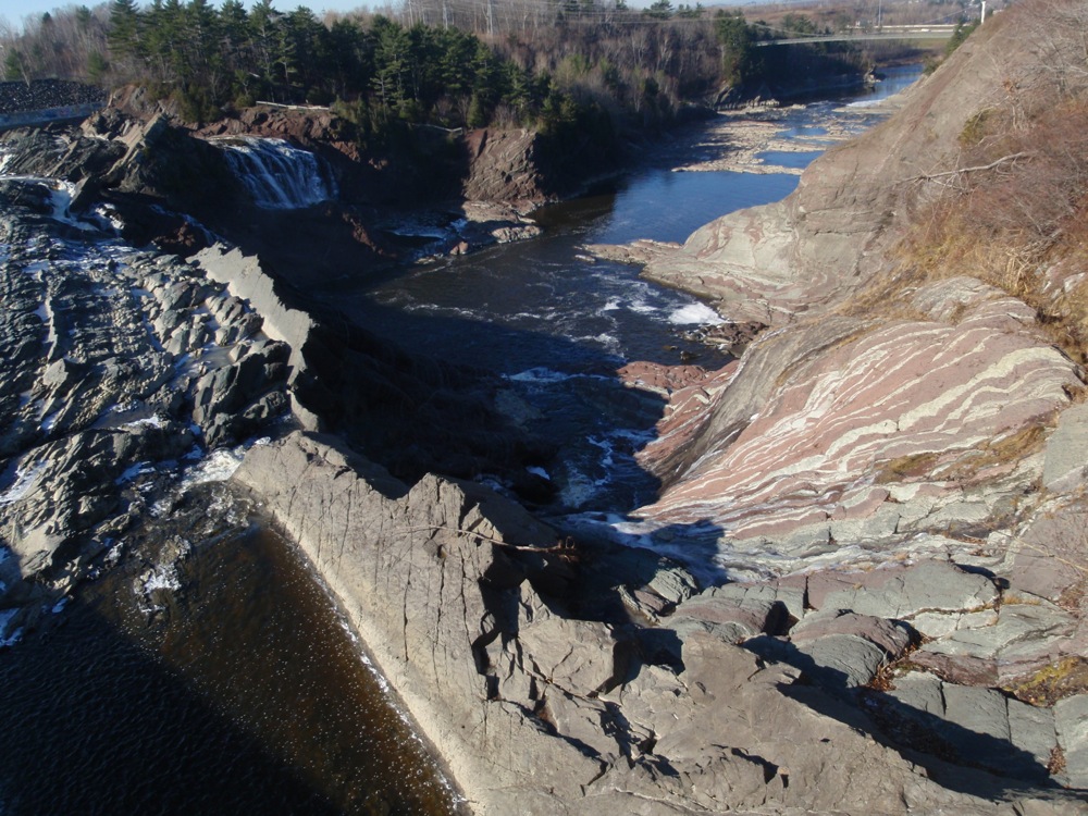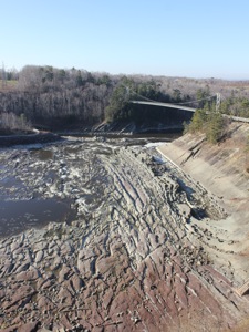 Chaudière Falls is a large waterfall on the Chaudière River, just before it enters the Saint Lawrence River. It is only half the height of the nearby Montmorency Falls, but it is much, much wider. The Chaudière River also has three times the average flow of the Montmorency. A lot of the water is diverted for power generation before it reaches the falls. Depending on water levels, the falls can be a span the whole 120m, or be broken up into several separate segments.