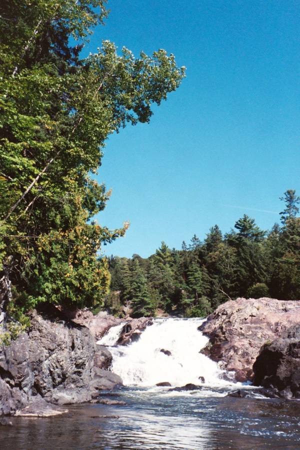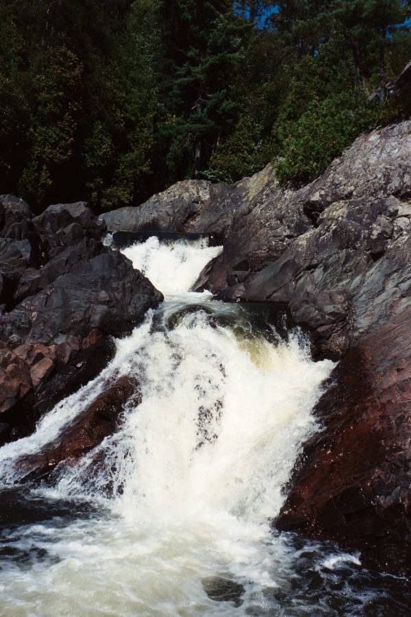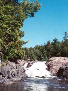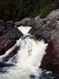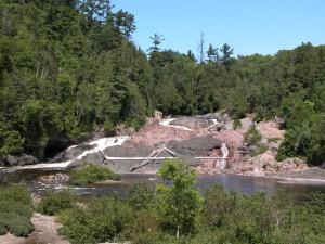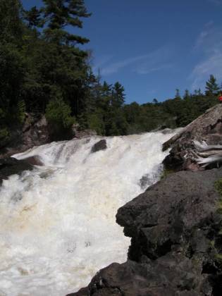 The Chippewa Falls are right along Highway 17, about 30 miles north of Sault Ste. Marie and 90 miles south of Wawa. There is a roadside park. The falls are visible from the road. This is a complicated falls consisting of several drops. You can walk up either side of the falls, and climb on the rocks. This is also the midpoint of the Trans-Canada highway.