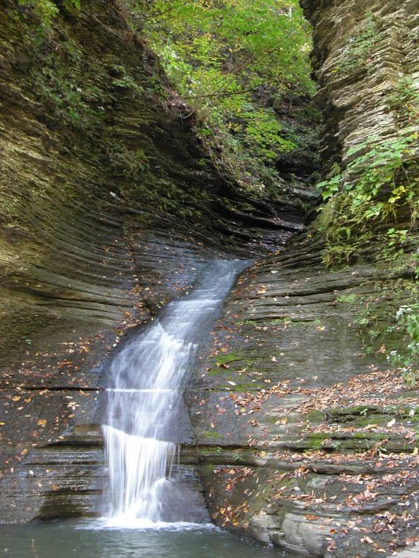 Clarks Gully is a located a few miles north east of Naples New York. This is the most adventurous of the four glens and gullies in the area. A short creek walk takes you the base of the pictured falls, which is about 20 feet high. Beyond this in the upper gorge two more waterfalls of over 60' can be found, however getting beyond the first waterfall is not trivial. I was not sufficiently motived or informed that day to figure out how to get past it.