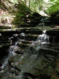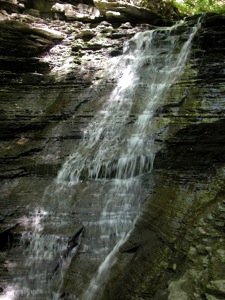 A 1/4 mile from the parking area the creek turns s sharply to the left (facing upstream). There is a cascading falls here that you can walk up with some effort. Some ropes were available to help with the ascent the first time I visited, but were gone a couple years later. This leads to an open area surrounded by sheer walls over a 100 feet high, and a larger (20'), steeper waterfall.