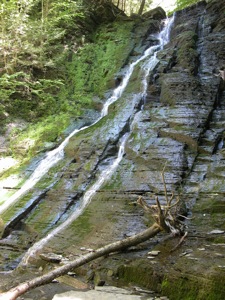 The next section of the gorge is more open. You can also reach this section from trails along the rim. There is a parking area somewhere, possibly off of Shay Road. You can also reach the rim trails from the mouth of the gully. As you continue up stream you will pass more small falls, and one steep 15' falls. The creek forks. Follow the right fork (facing upstream). There is a section where the creek has been buried by a landslide. Finally you will reach a big falls over 50' high. This is an impressive falls. The water was a bit low when I saw it. This is the end of the trail, unless you are willing to climb up the very steep sides of the gorge, or, as some people do, climb up the waterfall. I do not believe there are any more falls above this one.