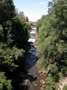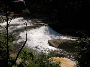 The Little Falls is located right in downtown Cuyahoga Falls and is at the head of one of the most impressive stretches of the Gorge. Unfortunately there is a major freeway on one side of the gorge, and a large hotel on the other, so getting a closeup views of the falls is not easy. There is an old bridge at the end of Prospect Avenue from which you can get a nice but distance view of the falls, and a very nice view of the gorge downstream of the falls. There is apparently a restaurant in the hotel from which you can get a closer view of the falls. From the street you can get a close view of the small dam just above the falls but not of the falls themselves.