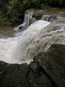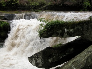 Dunloup Creek is one of many creeks that tumbles into the New River Gorge. The creek drops over a 20' sandstone ledge about 2 miles from the river. The falls is located right along side Route 25. There is a small turnout by the falls, but otherwise there are no signs, fences or any other development here. The falls are visible from the turnout, but to get a good view you have to walk down the banks. There is a railroad on the other side of the creek. Like many hilly areas, the railroads and highways follow the gorges cut by the creeks through the hills.