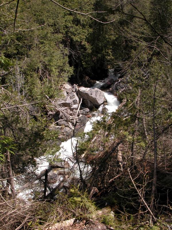 If you head away from the gorge, you will find a large well groomed trail. This trail leads out of the World War I monument near the parking area, and it may be part of the Bruce Trail. If you follow this trail downstream for 20 minutes, you will eventually reach the level of the river. The trail does not lead exactly to the river, but it gets you close enough. From here on, there is no official trail. I did see one red blaze, but that was it. You can slowly work your way up along the river banks. There are a lot of mossy rocks and piled up deadfall left behind by high waters, but if you perservere and do not slip and crack your head open on the rocks, you will see lovely stretches of white water, a 30+ foot, hard to photograph lower falls of the cascade variety, and finally a wonderful view near the base of the falls.