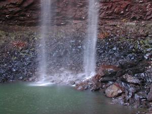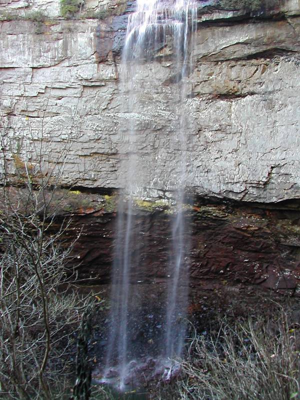This is not a large creek, so there usually is not a lot of water going over the falls. There is a dam above the falls, and they try to guarantee that there will always be some water going over the falls. In November 2006 the falls were pretty thin. Fall Creek Falls has a seasonal companion, Coon Creek Falls, which is the water stain visible to the right of the falls in the pictures. After a good rain this turns into a spectacular 250 foot plunge.