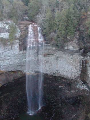 Fall Creek Falls is the namesake of Fall Creek Falls State Park. This waterfall is the highest single plunge east of the Mississippi. The water is not in free fall at the very top of the falls, which I think is included in the total height, so the true plunge is closer to 200' than 250'. Whitewater Falls in North Carolina, and Crab Tree Falls in Virginia are both over 400' high, as are some other falls in New England but they are all steep cascades with multiple drops. Taughannock Falls in New York drops 215 feet in a single plunge.