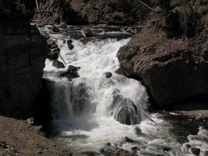 Firehole Falls is in Yellowstone National Park, just south of Madison. There is a short one way side drive through Firehole Canyon. This waterfall is smaller than many of the others in Yellowstone, but it is still interesting. There are cascades and small falls above and below the main falls.