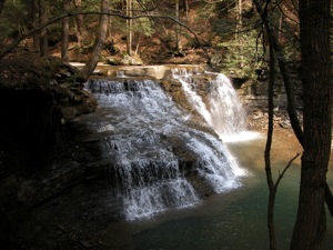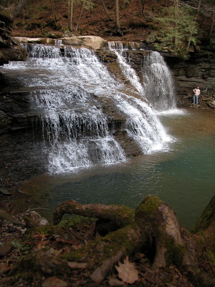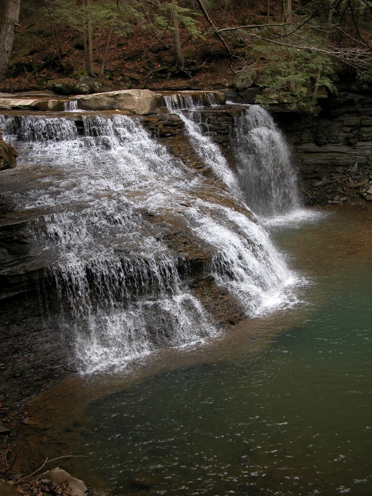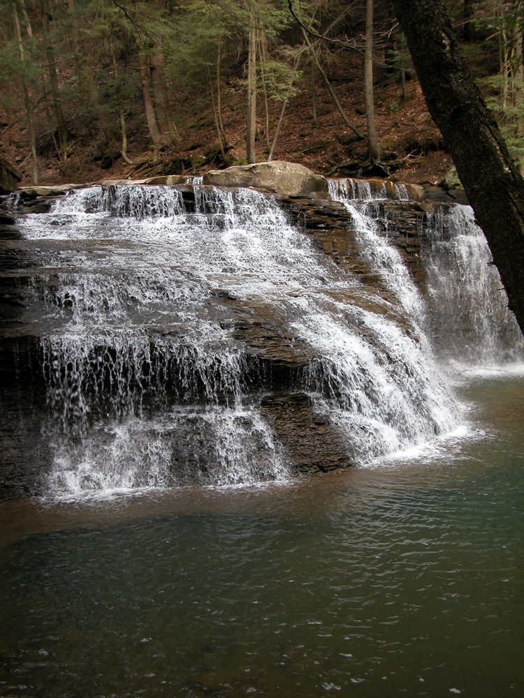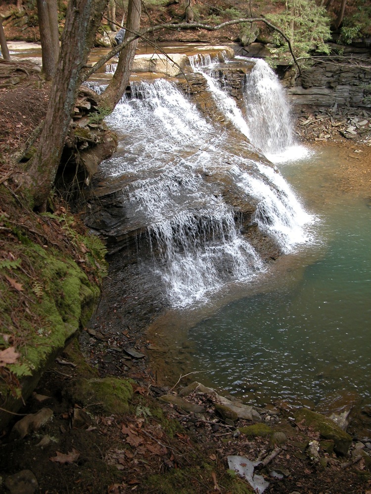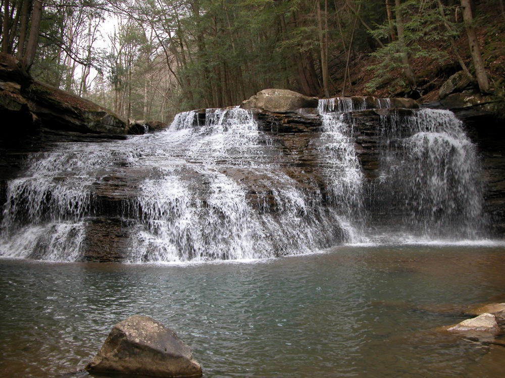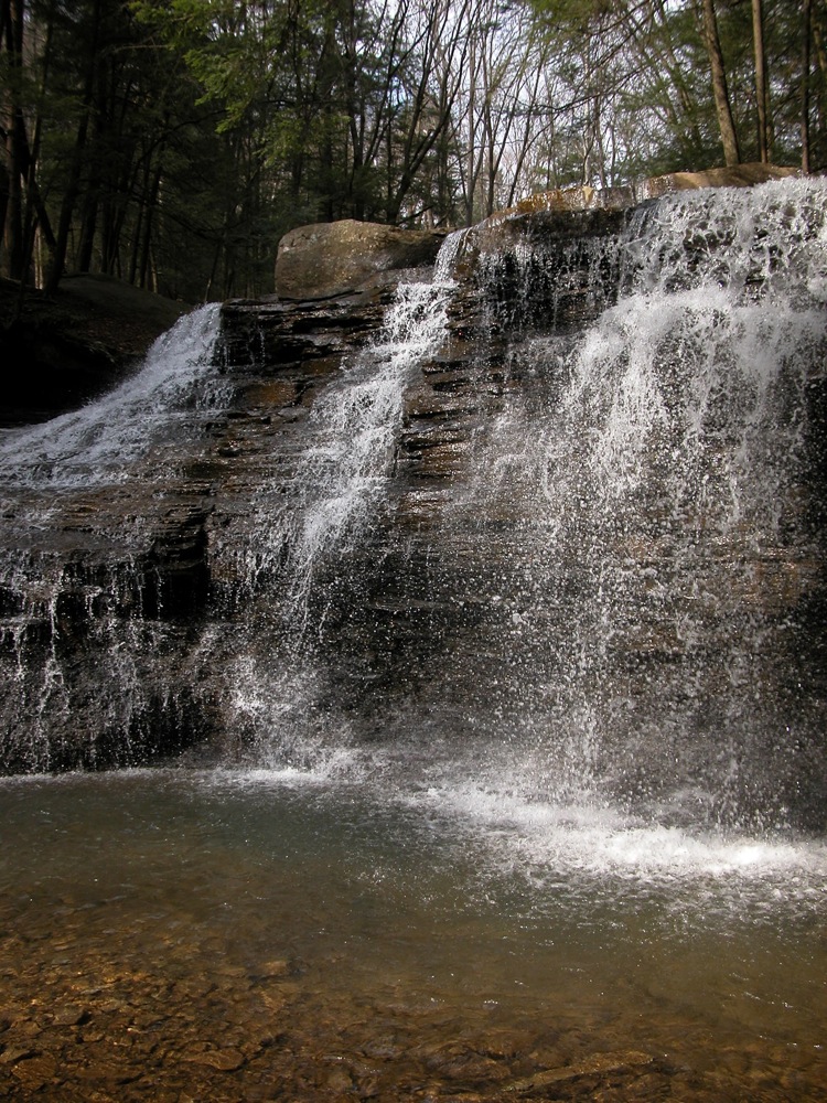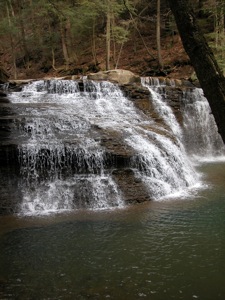 Reaching this falls is a bit of a challenge. There may be easier ways to get there, but here is roughly how I did it. From the town of Emlenton, head east on Route 38/208. Take a left on Sloan/Panther Spring Road. The road changes name, and I am not sure how it is signed at this point. This is a dirt road, and quite bumpy in some spots. Continue straight on this road. You will cross Whitehall and Airport roads, both of which are paved. The road continues into a wilderness area, and is called Dotterer for awhile. You will pass some old bridges, and climb up a switchback. You eventually reached a paved road again outside the town of Pittsville. Here you take a left on Rockland Station Road, and continue for about a mile. There is a small parking area on the left side of the road near the falls. From there it is a short walk to the falls.
