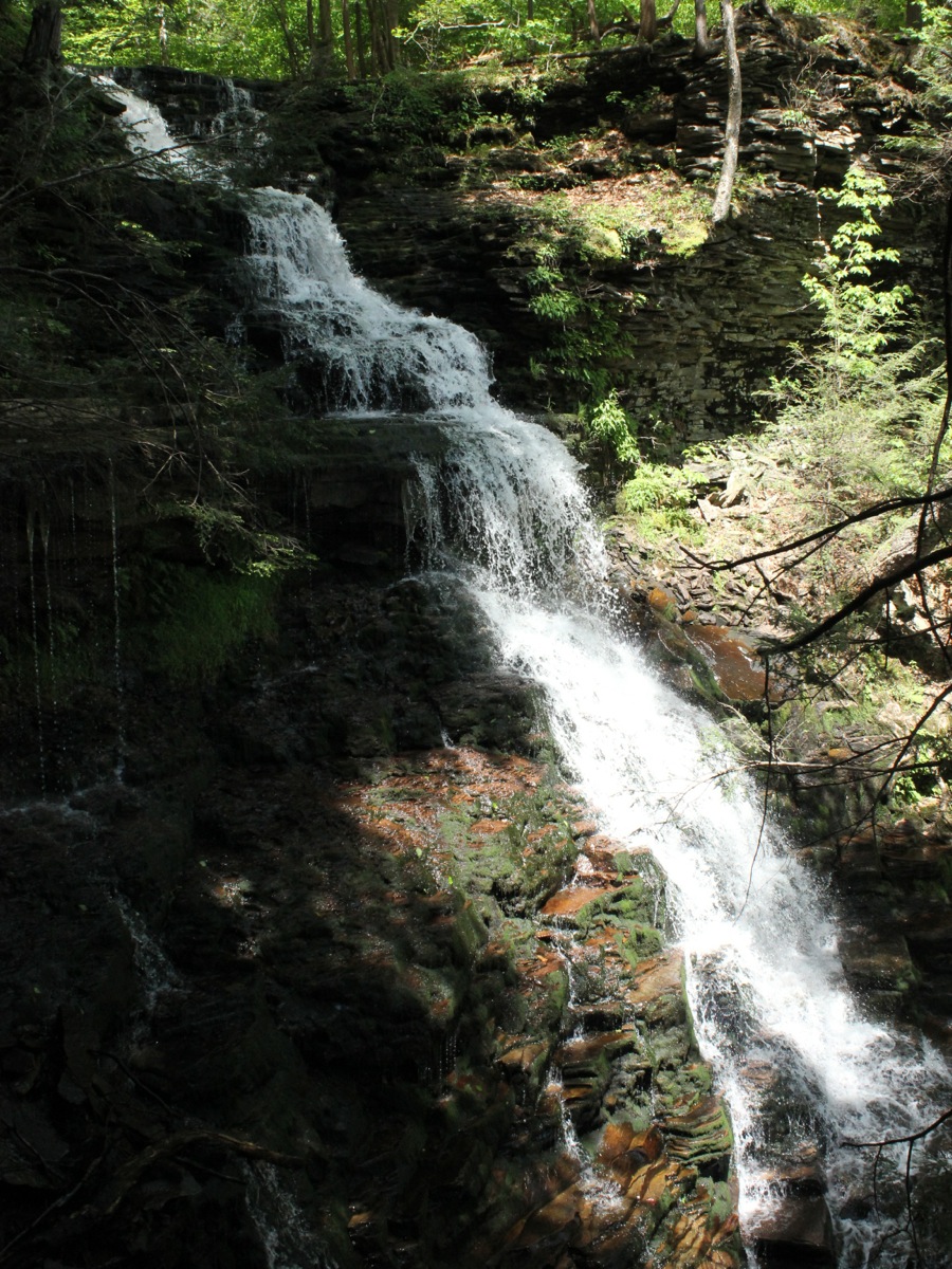 Ganoga Falls is the largest of the many waterfalls in Ricketts Glen Start Park. The falls drops 94' feet in two distinct sections. The top half is a steep narrow slide that fans out. The bottom half is a wider, and the rock face is nearly vertical. The falls is considerably higher than any of the others in the park, or in the nearby state lands. The runner up, Ozone Falls is only 60' high.