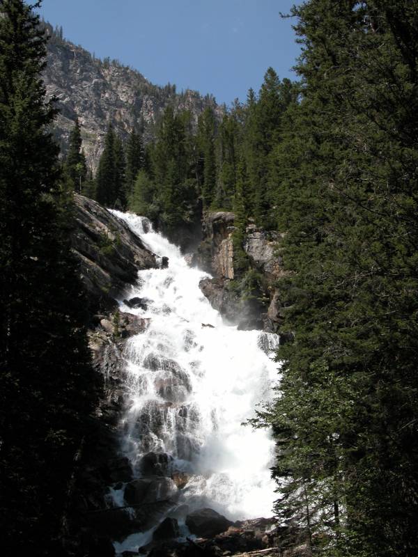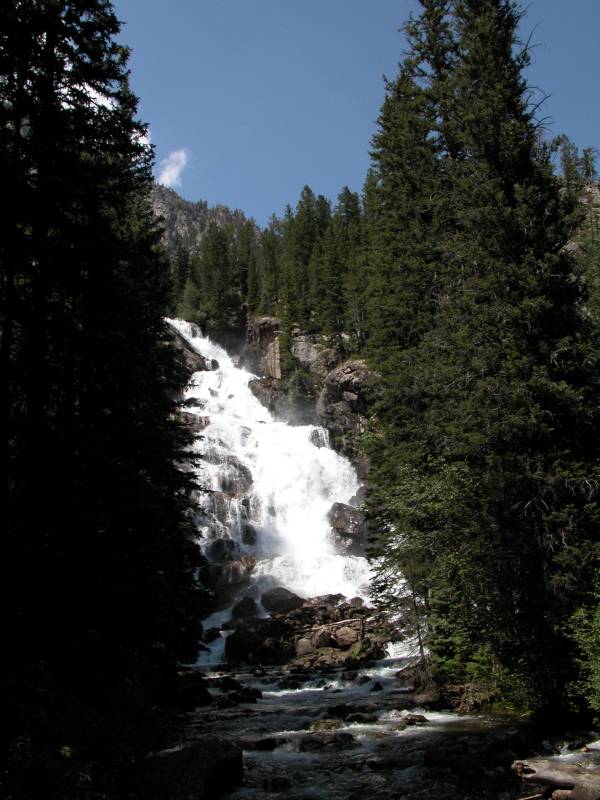 There are several waterfalls in Grand Teton National Park, but most of them are quite remote. A lot of the waterfalls there are more of the cascade variety, and the water never really leaves contact with the rocks. They are snow melt running down the sides of the mountains, and even though they may be quite large, they are not that impressive, especially at a distance.