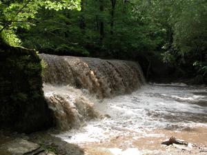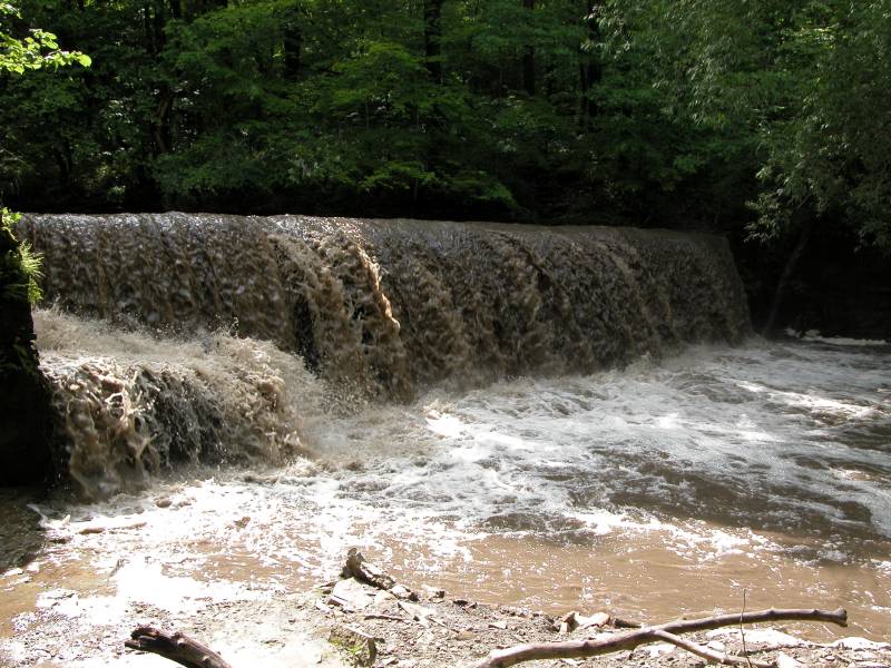 I visited the falls the day after several heavy thunderstorms. There were flood warnings in nearby communities. The heavy rains washed a lot of mud into the creek, which is why the photos look something like one of Willie Wonka's chocolate waterfalls. This is one waterfall that probably looks more scenic with less water in it. By the looks of the surrounding area, the water level was considerably higher earlier in the day. Parts of the trail were underwater, and the plants along the shore were all flattened and pointed downstream.