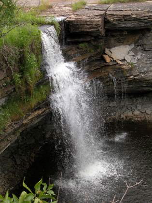 The waterfall is in a rather flat, treeless and unassuming location. The creek flows under Hwy 6 and then plunges into its gorge. If you are heading south on Hwy 6 there will be small picnic area on the left. Here you can take a break and have something to eat, but you cannot get a very good view of the waterfall. For a better view, continue south on Hwy 6 for a short distance and take a left onto High Falls road. This is a narrow dirt road that leads back to the brink of the falls. It is in good condition and will give a regular car no trouble.