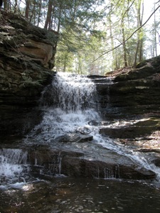 Reaching the falls is easy. The park is located on the north side of Hazel Dell Road about a mile east of US 62. Hazel Dell Road meets US 62 just south of the Kokosing River. The park has a sign and a small parking area. The falls are just a few hundred feet from the parking area, and can be easily heard when the water is flowing.
