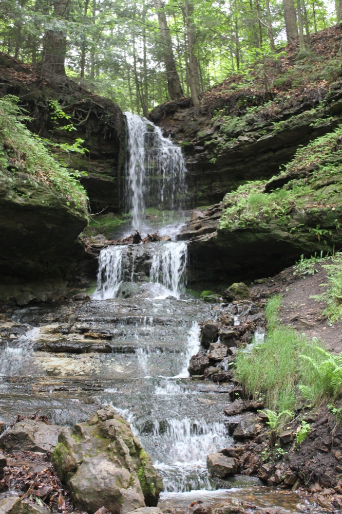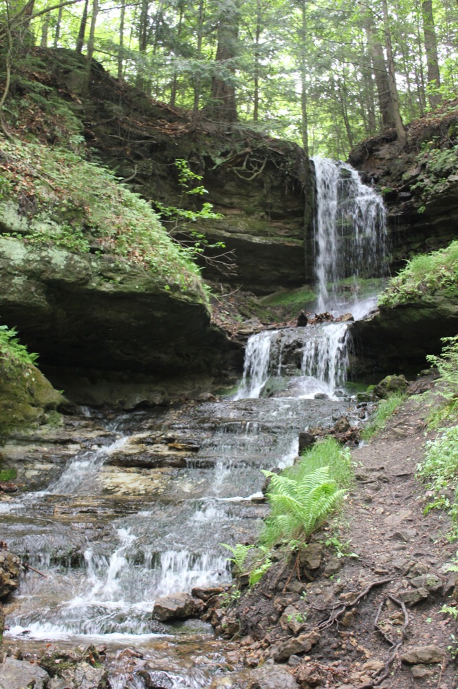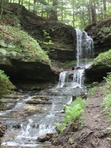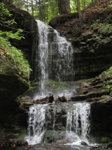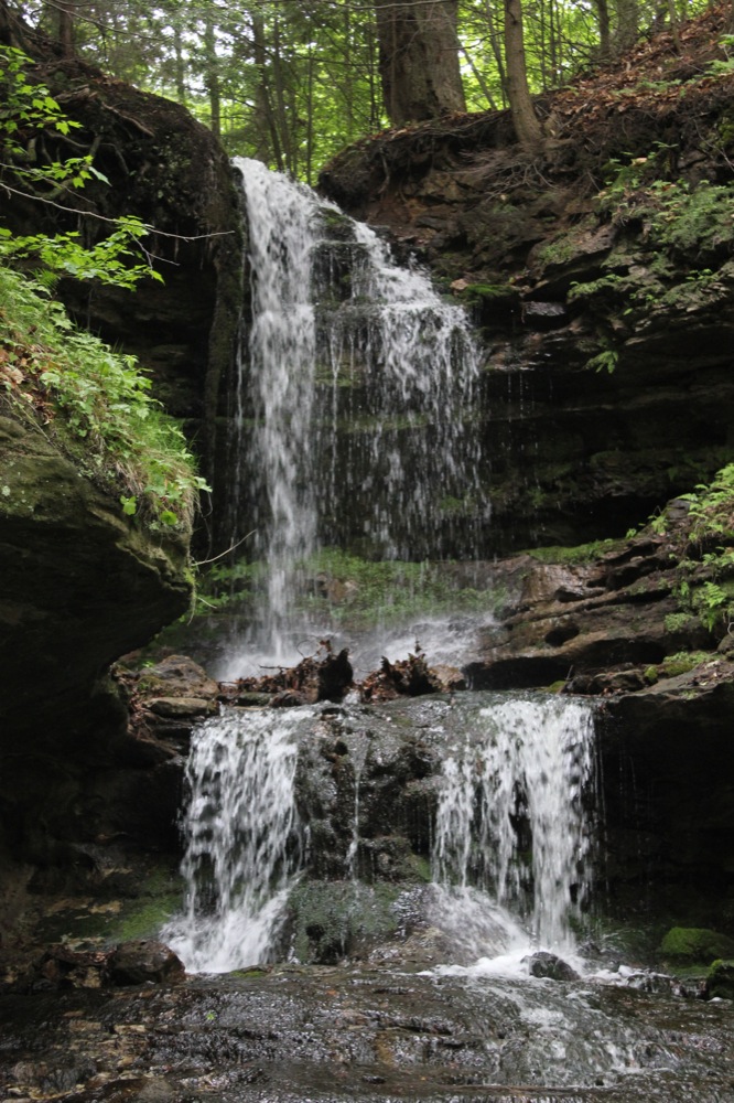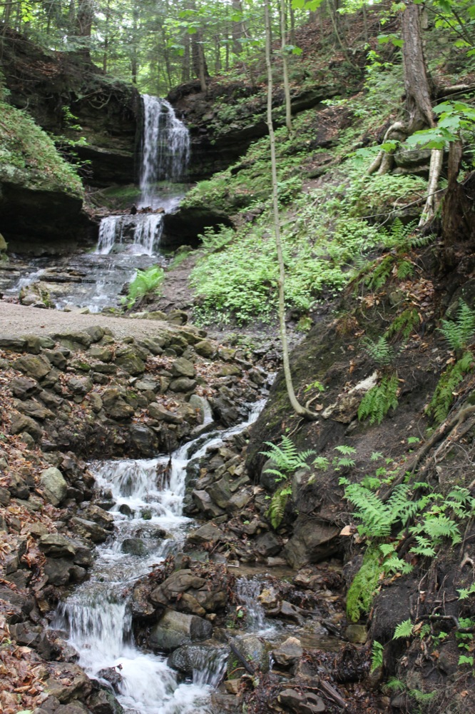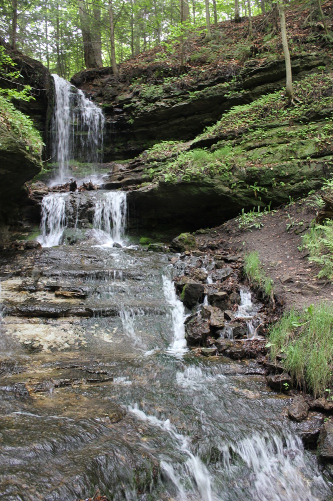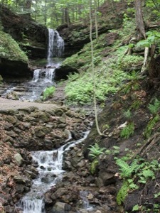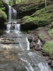 This is a pretty waterfall. It plunges about 20 feet, and then tumbles down a long series of cascades for another 20 feet or more. The waterfall is spring fed, so it may be running when the other nearby falls thin out in the summer months.