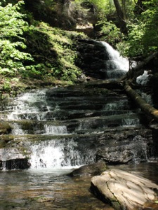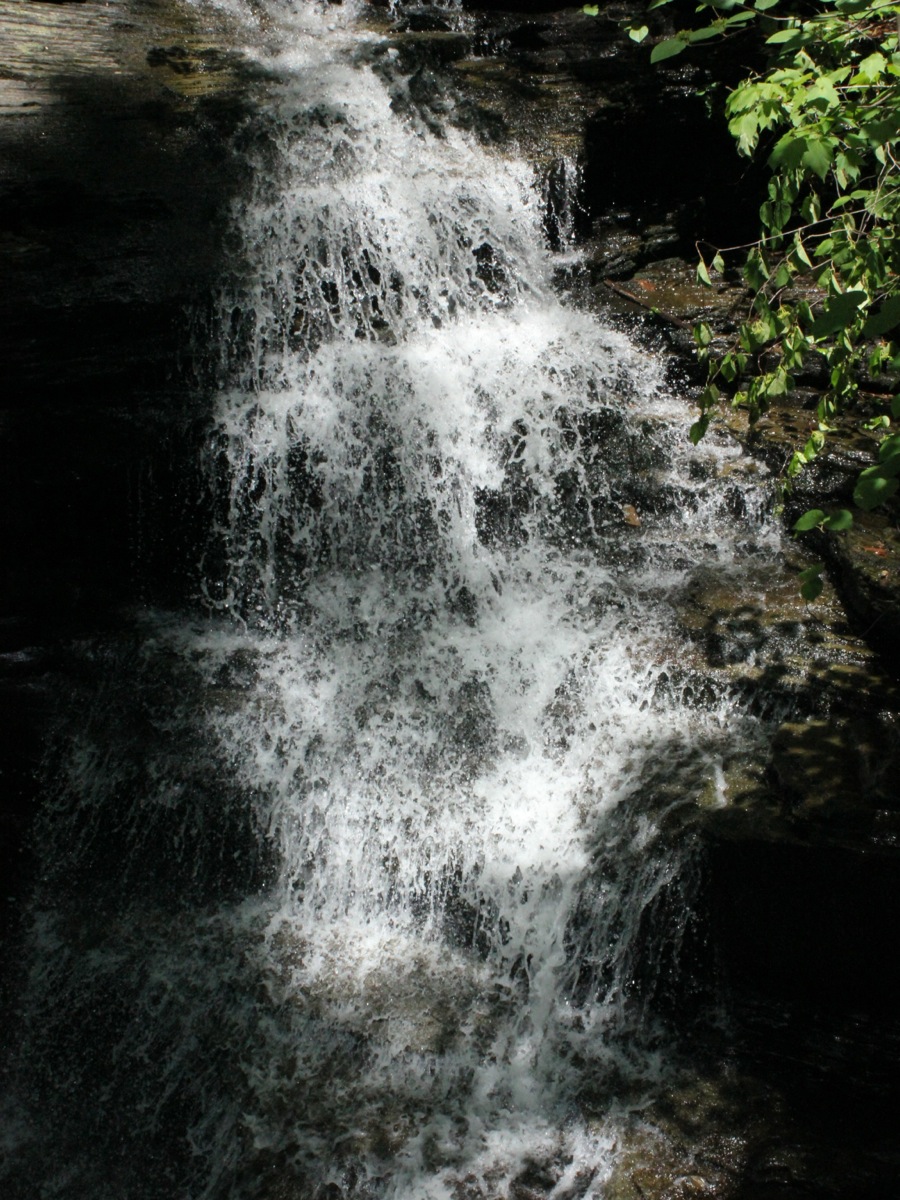 Huron Falls is the fourth falls from the top of Glen Leigh. The falls consists of a steep curving slide, followed by a sharp turn to the right, followed by a smaller, less steep drop. Because of the curve in the falls, you cannot really see all of it from a single vantage point.