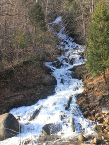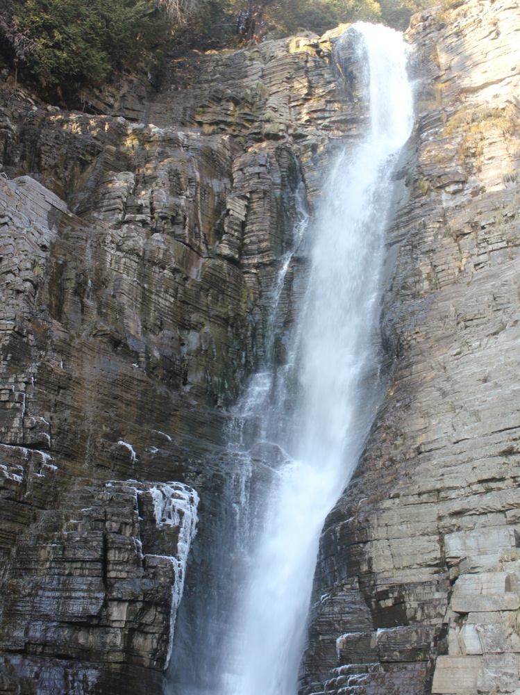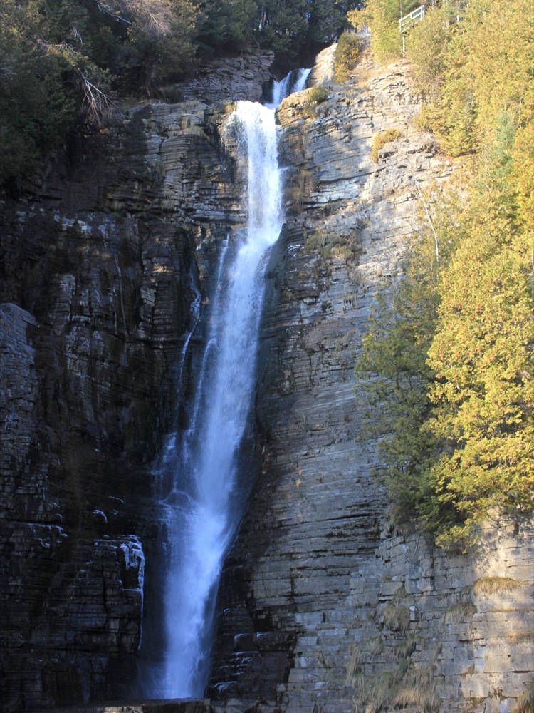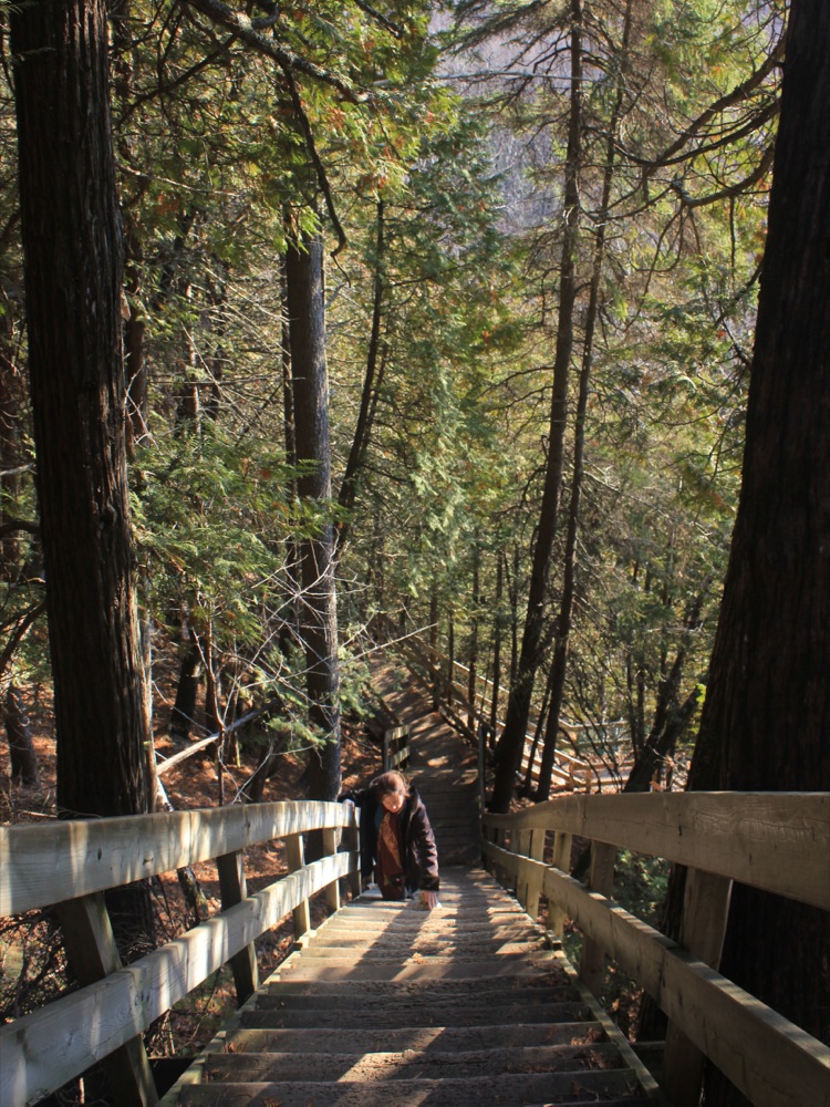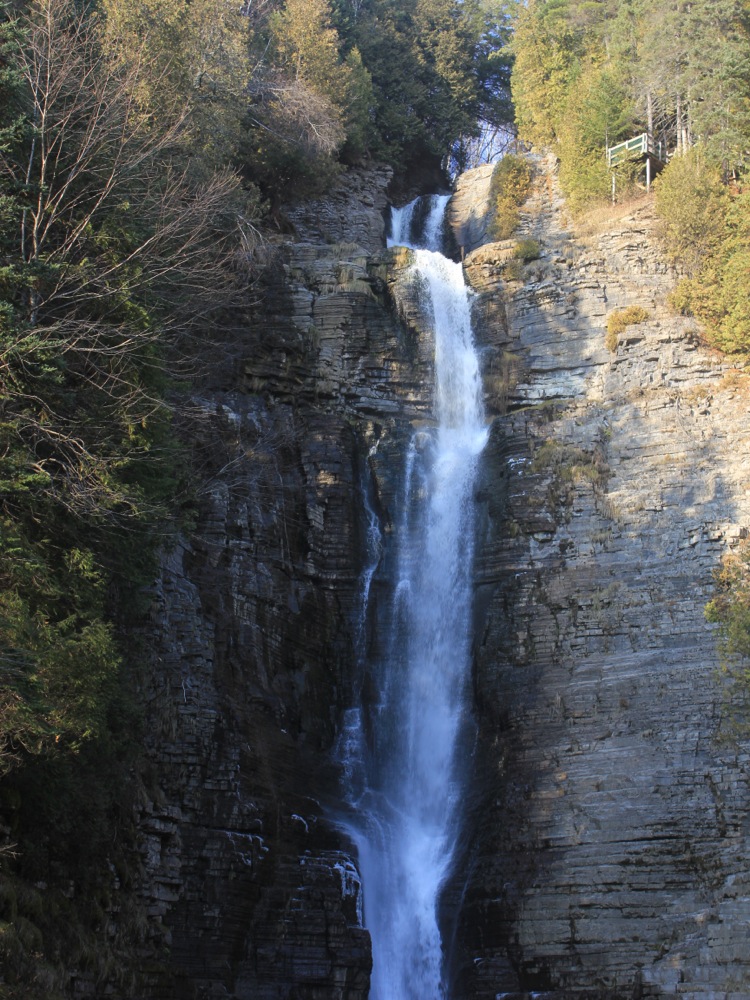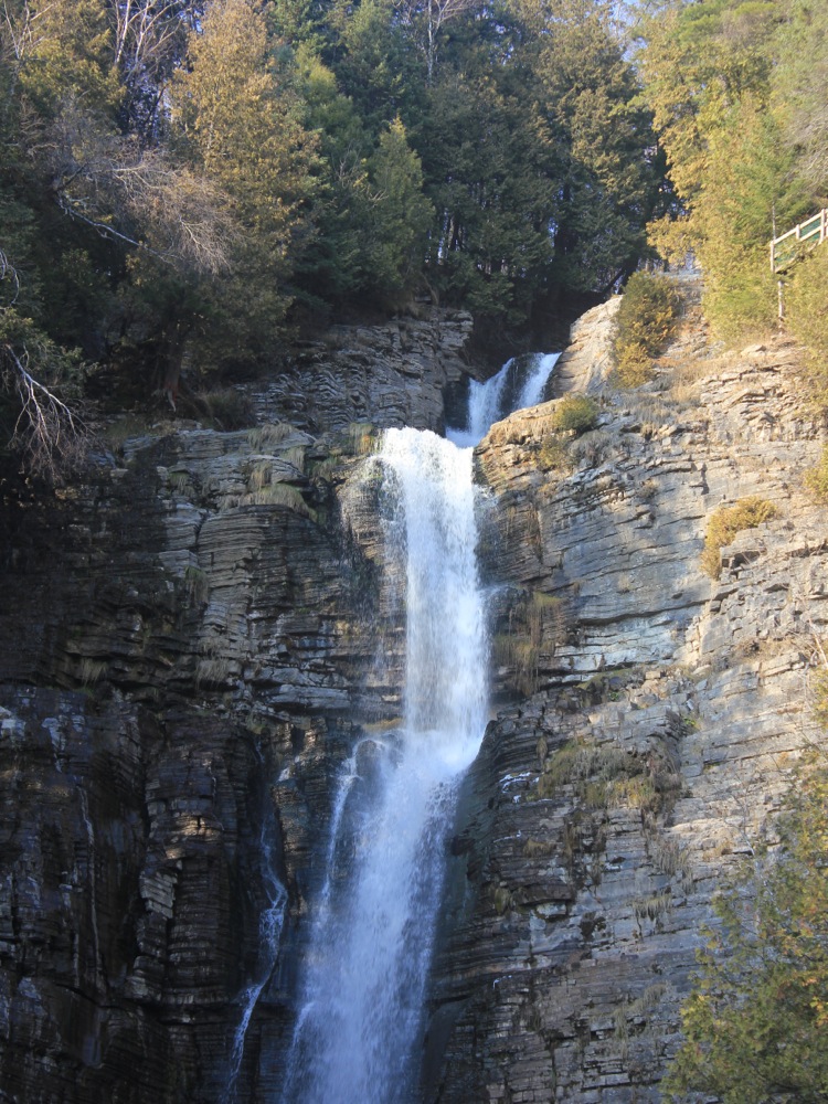 There are two viewing platforms on the way down, each roughly at the base of the first two drops. It is hard to get a good view of the falls, due to the trees. But the view is still impressive.