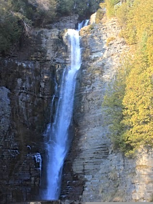 There are many interesting things about this waterfall. At the base of the falls there is a flat open rock courtyard. A natural wall separates the river from the open area. I am assuming it is all natural. It is possible that the area was quarried at some point. In any case, it would be a perfect spot for a wedding, assuming you could get everyone down the stairs.