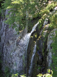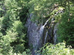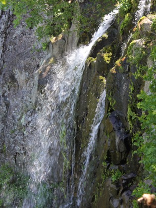 The falls is located near the Big Meadows Campground. The shortest hike to the falls starts at the campground ampitheatre. It is about a 1.2 mile hike down to the falls, and I do mean down. The trail descends nearly the entire way, and is very rocky. The trail crosses over top of the falls, and continues to a fenced in viewing area on the far side of the falls. The view was somewhat obscured by trees when I was there in mid June, and the waterflow was on the low side.