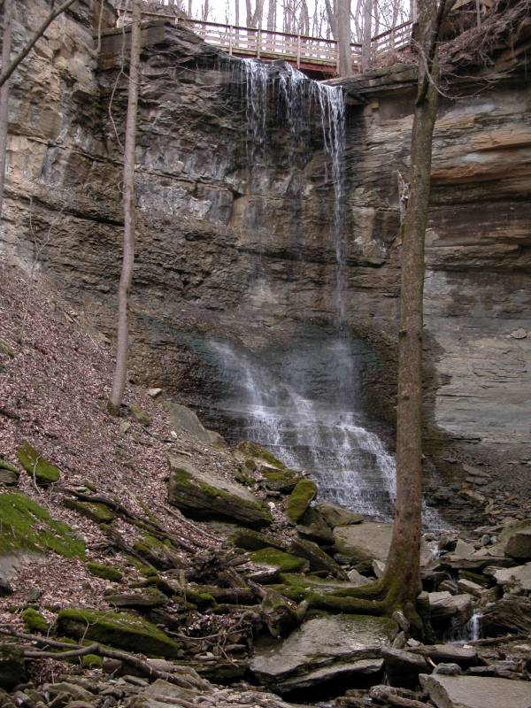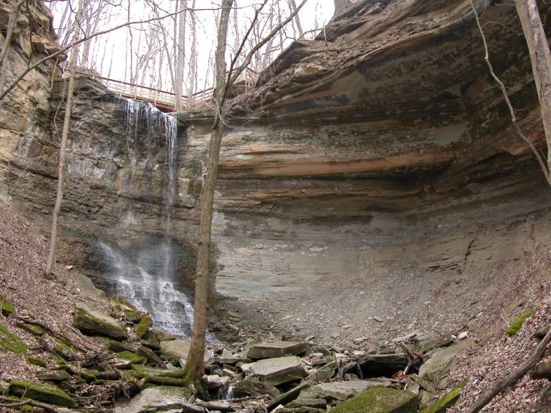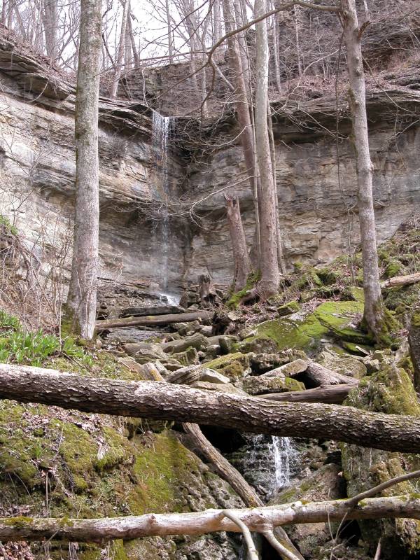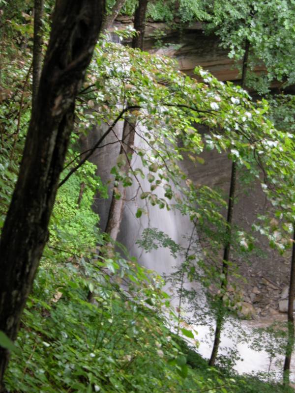 From the rim trails, it is impossible to get a good view of this waterfall. A foot bridge cross right over the top of the falls, and you can get tree obscured views from either side. Trail #2 leads to the base of Big Clifty Falls, and Little Clifty Falls is just around the corner. There is a third seasonal, unnamed waterfall just below Little Clifty Falls.