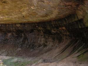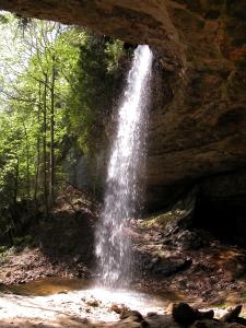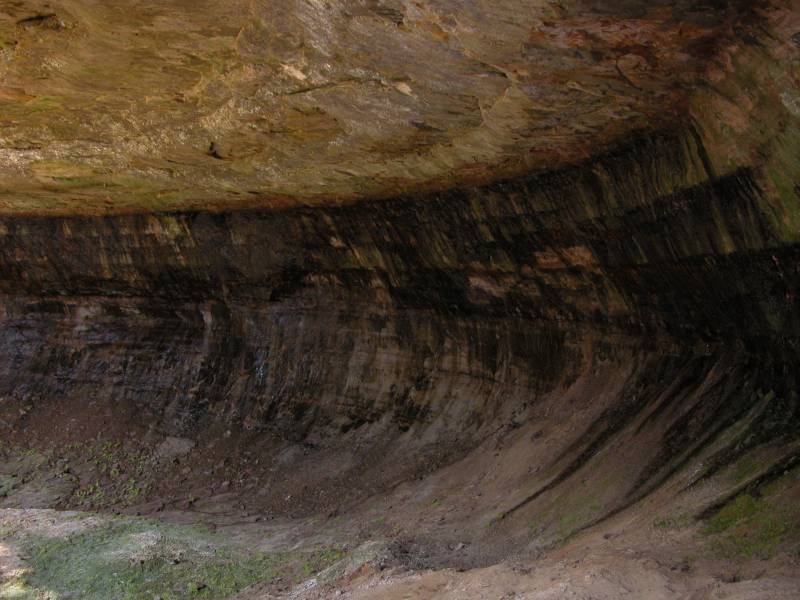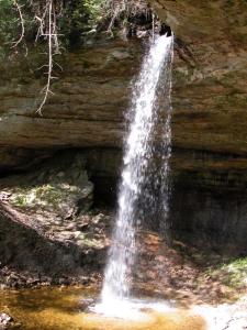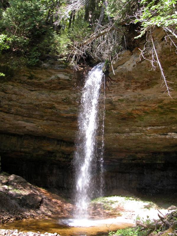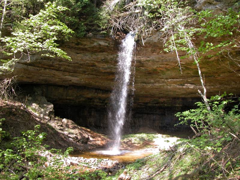 In addition to the main falls, there are a couple of other interesting things to see here. First is the large recess cave over which the falls plunges. The cave is around 80 feet deep, 120 wide and 50 feet high and big enough to hold a hundred people. The insides are colored and striped like the cliffs on the shore. Second there is an upper falls. Above the main plunge, the river runs through a narrow little gorge, at the head of which is a 15' high cascading waterfall.