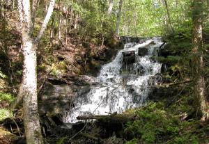 Reaching this waterfall is not easy. There is no trail. The falls is located on the east side of Miners River, just south of Miners Lake. The falls is about a mile south of where the road to Miners Beach crosses the Miners River.