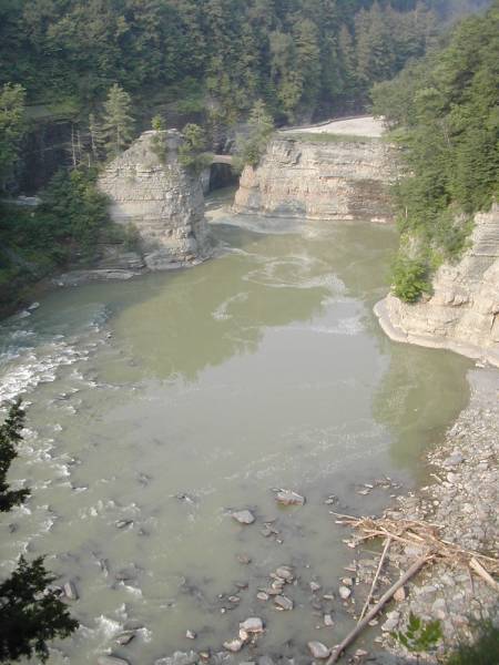 From the Lower Falls parking area, find the trail to the (right). The trail follows a fence along the rim of the gorge, and there are some nice views of the gorge. At a little corner in the trail you will see this view. The trail leads to a stairway, which takes you down to the Lower Falls. At the bottom of the stairs, the trail splits.